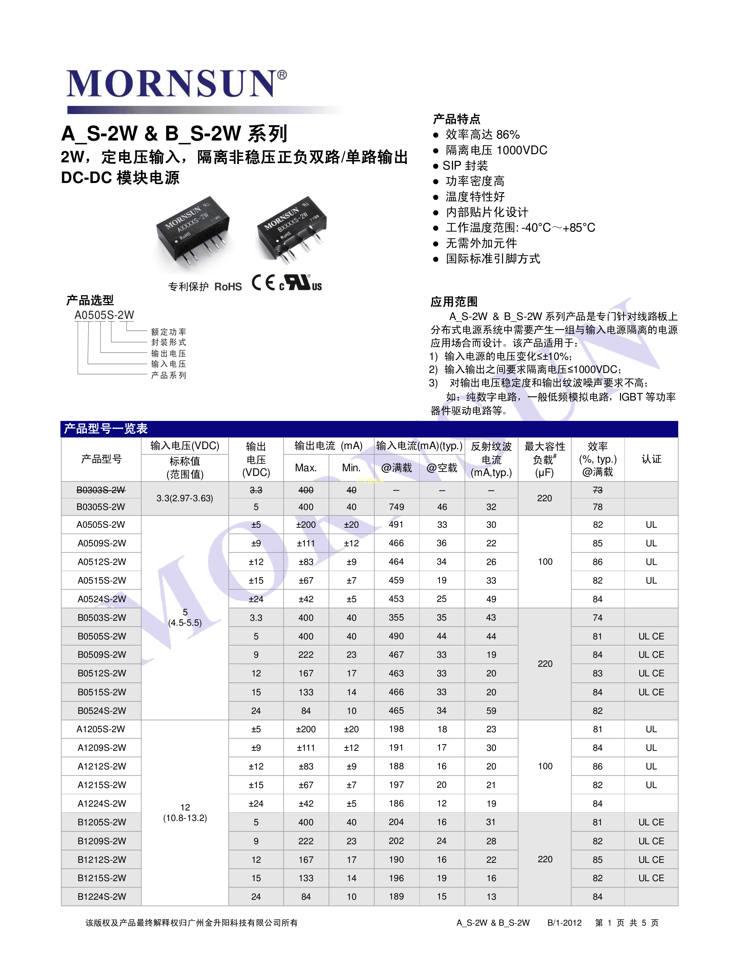 B2415S-2W数据手册ThroughHole封装MORNSUN(金升阳)PDF规格书,中英文下载