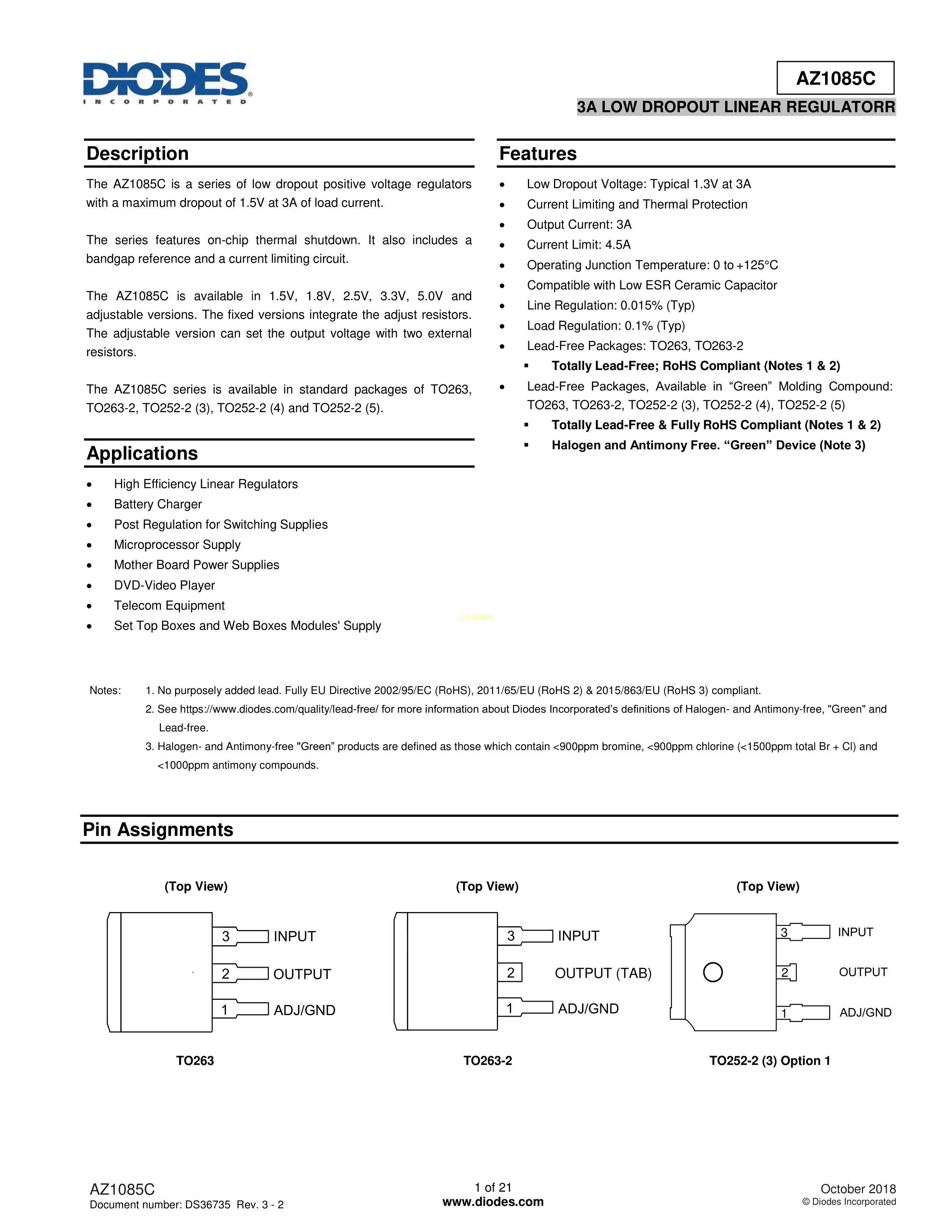AZ1085CS2-ADJTRG1数据手册TO-263-2封装DIODES(美台)PDF规格书,中英