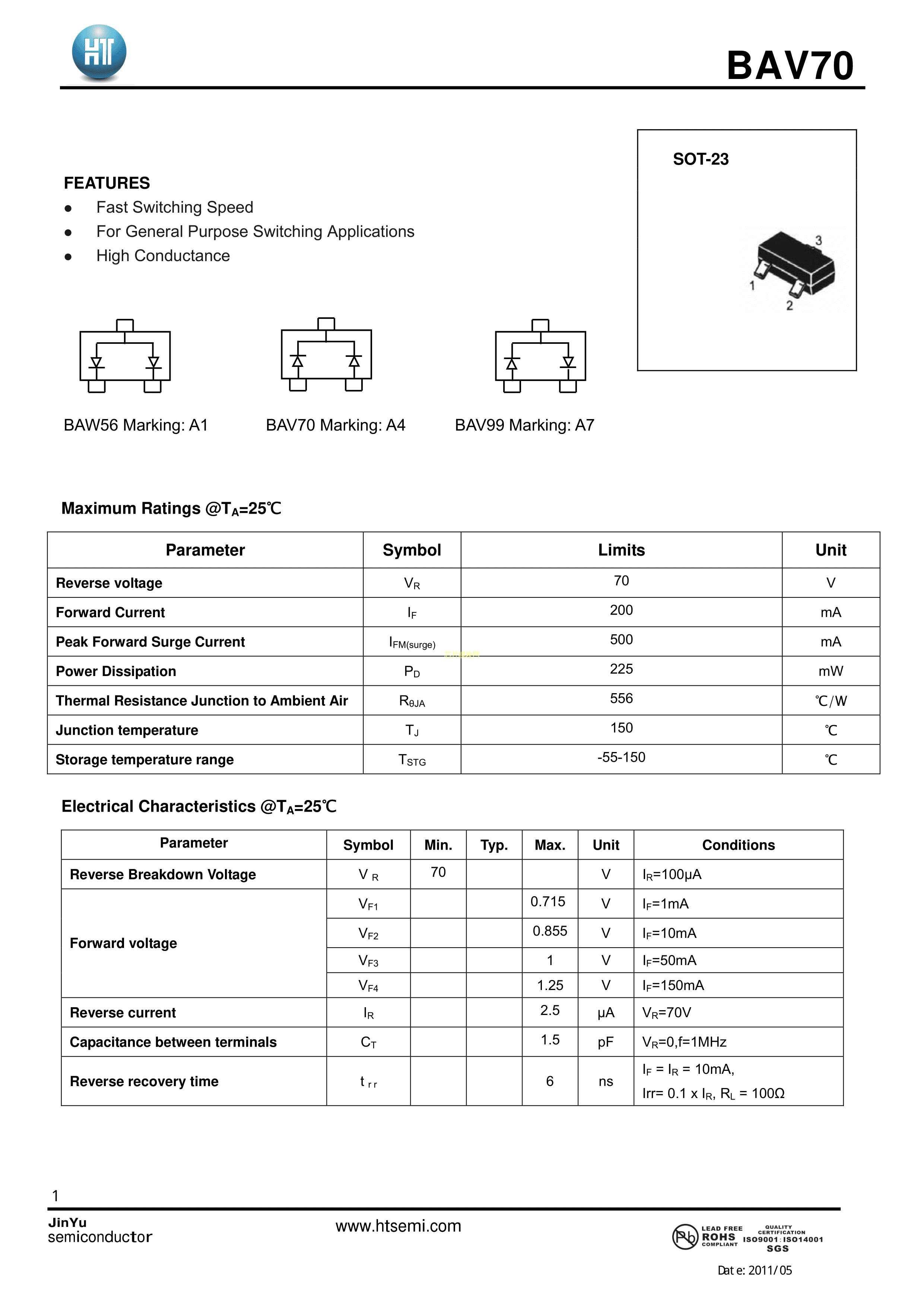 BAV70数据手册SOT-23封装HT(金誉)PDF规格书,中英文下载