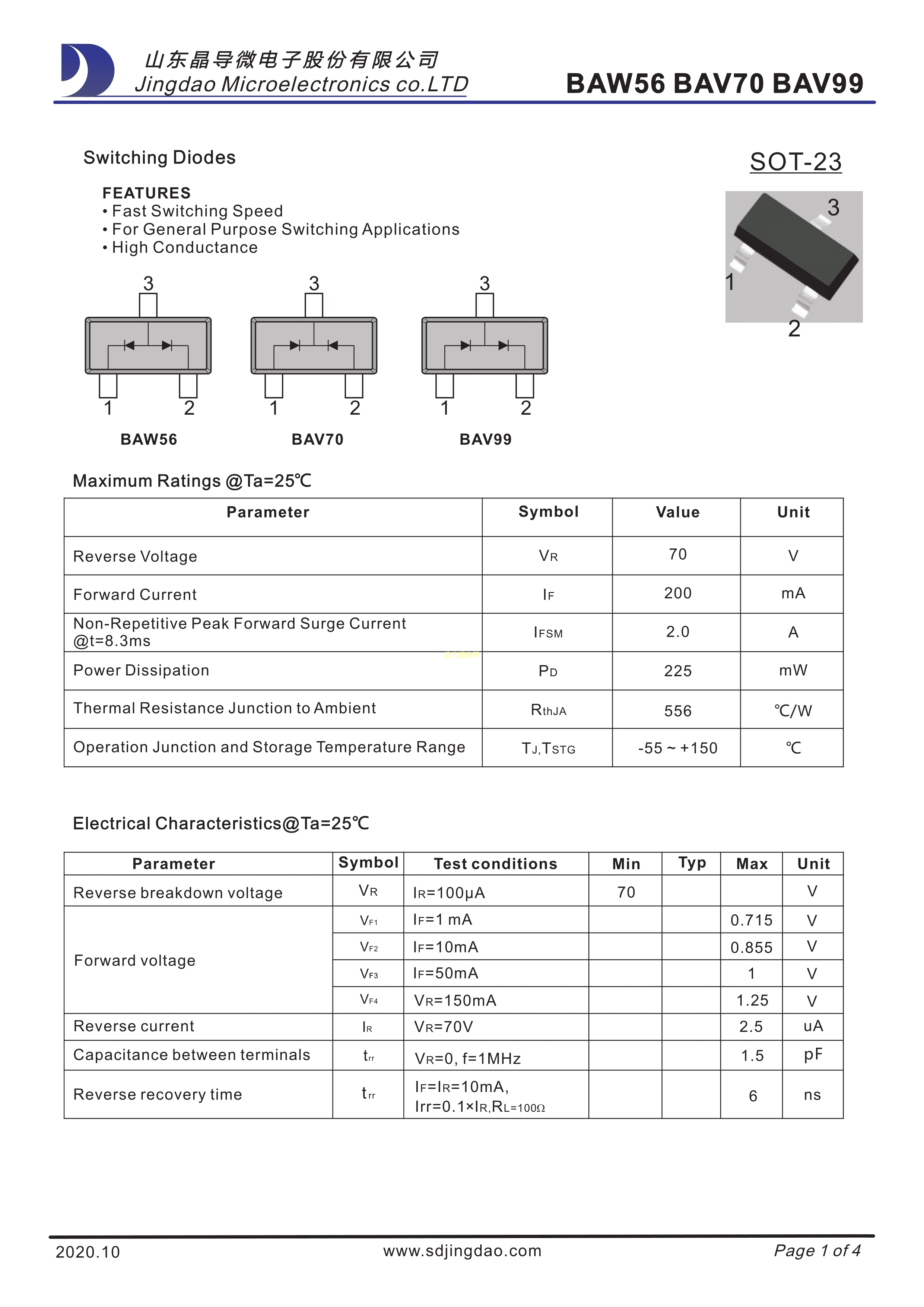 BAV70数据手册SOT-23封装晶导微电子PDF规格书,中英文下载