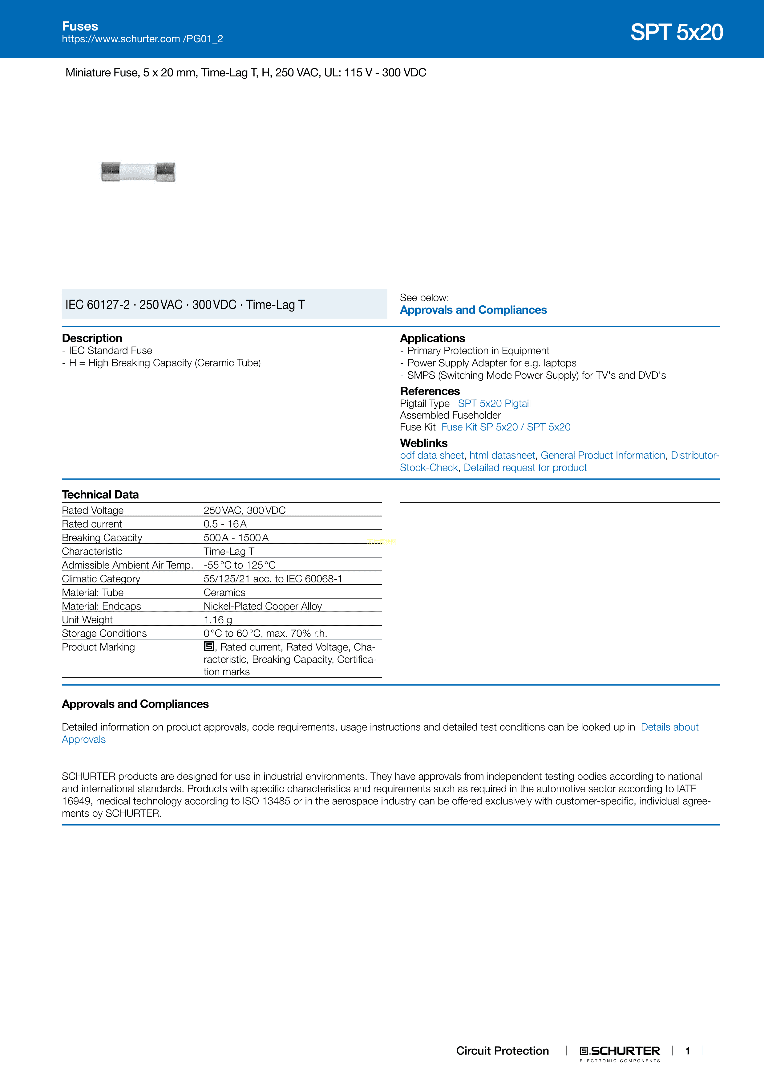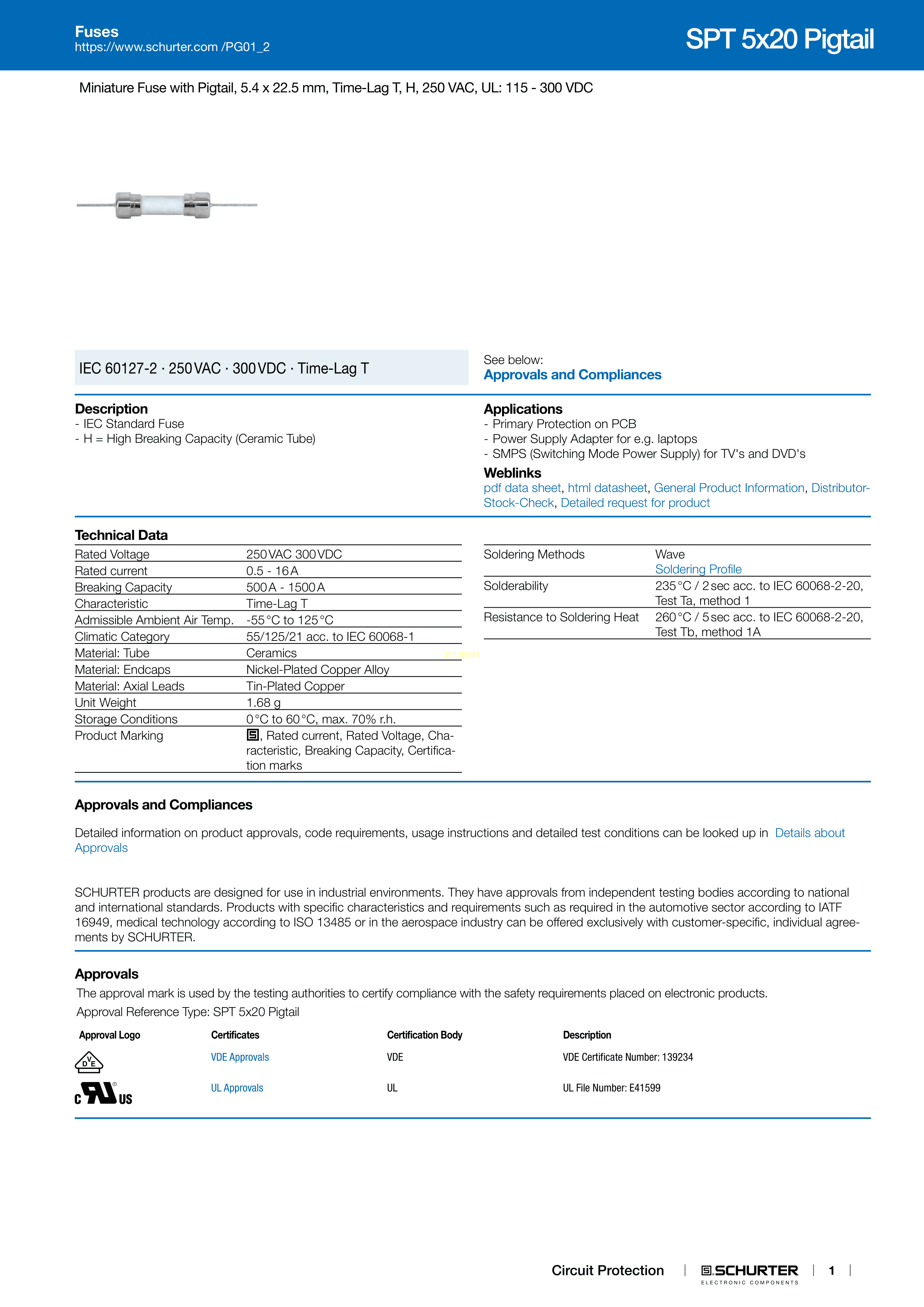 0001.2505数据手册管5.2x20mm封装SCHURTERPDF规格书,中英文下载