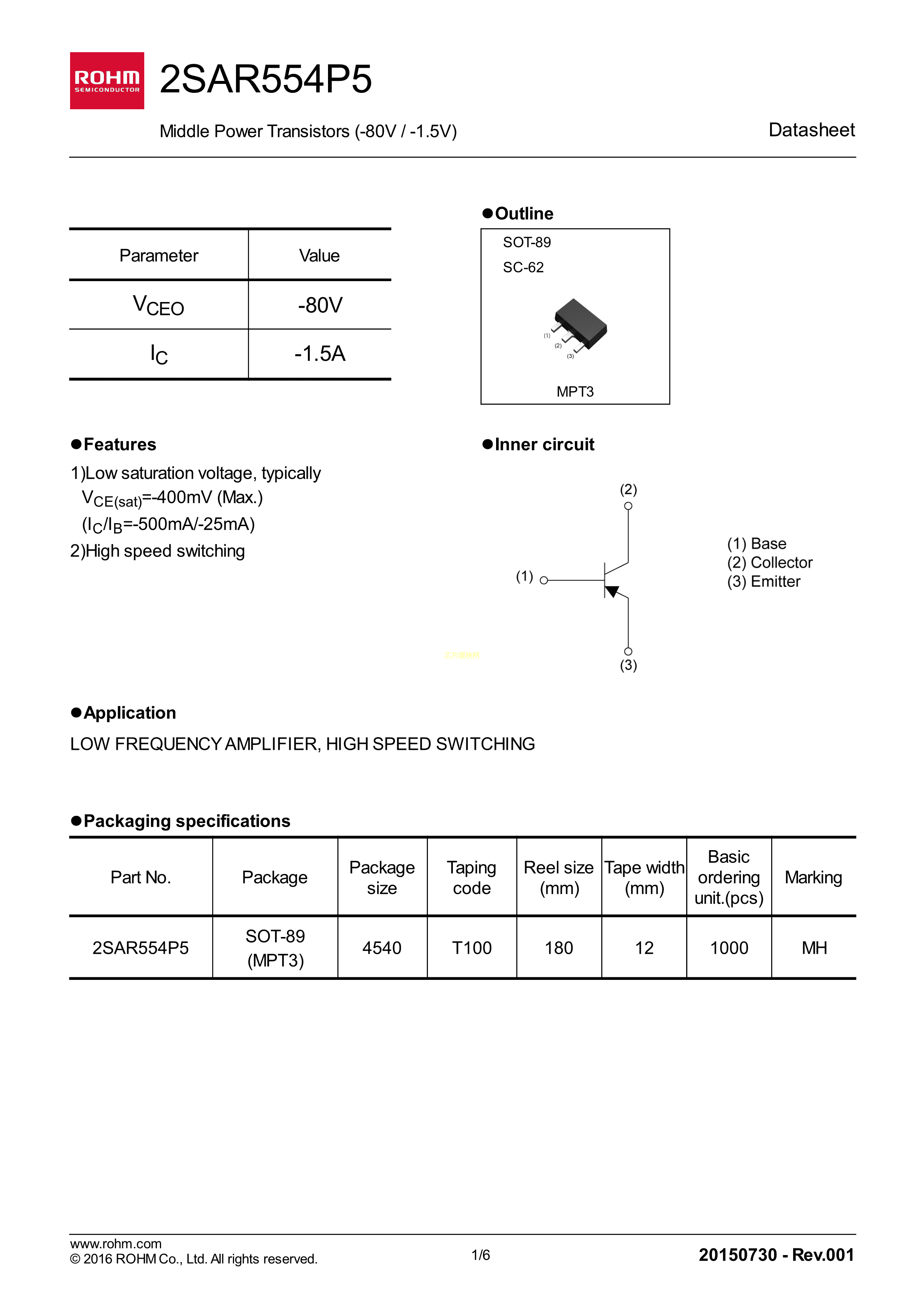 2SAR554P5T100数据手册SOT-89封装ROHM(罗姆)PDF规格书,中英文下载