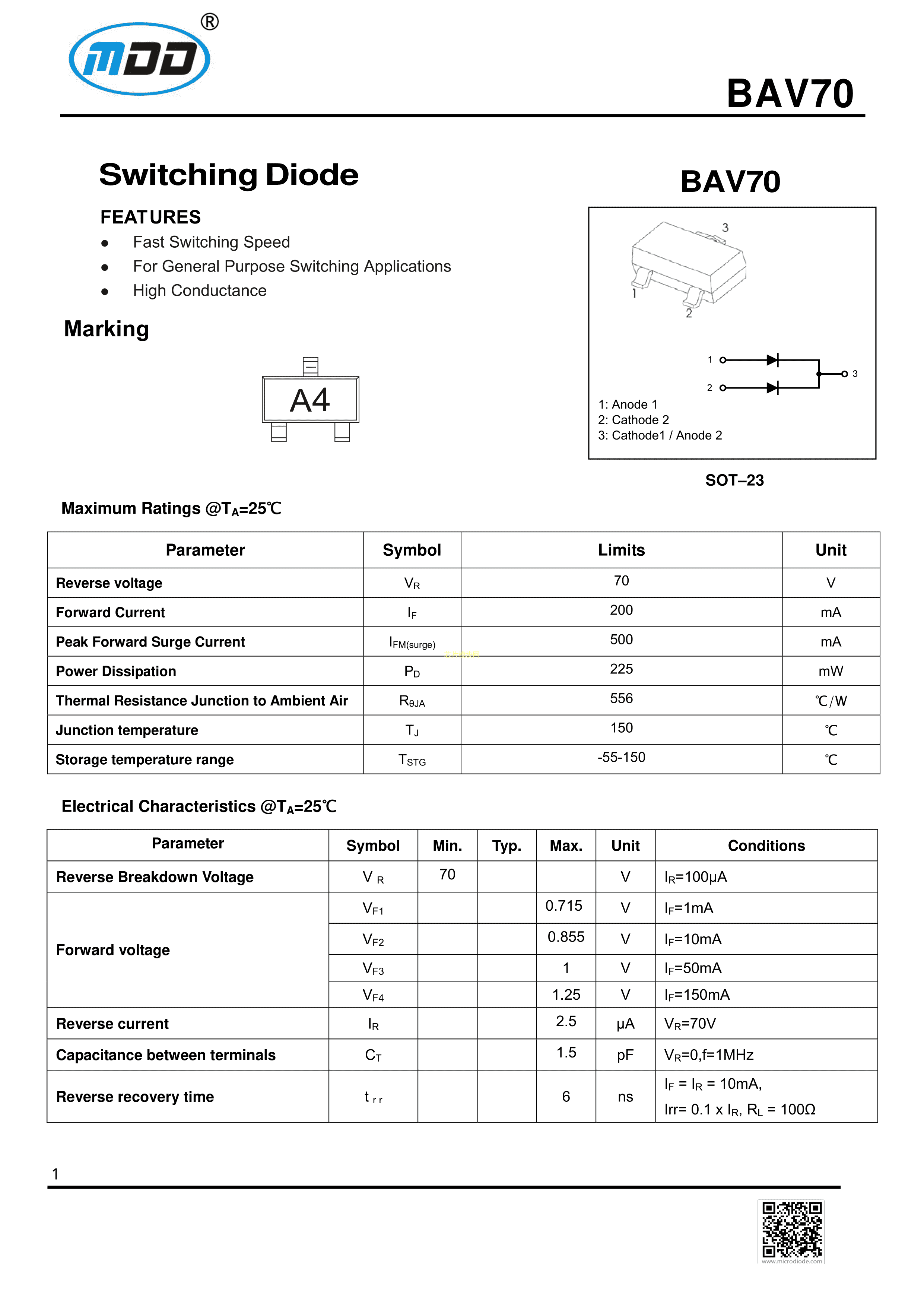 BAV70数据手册SOT-23封装MDDPDF规格书,中英文下载