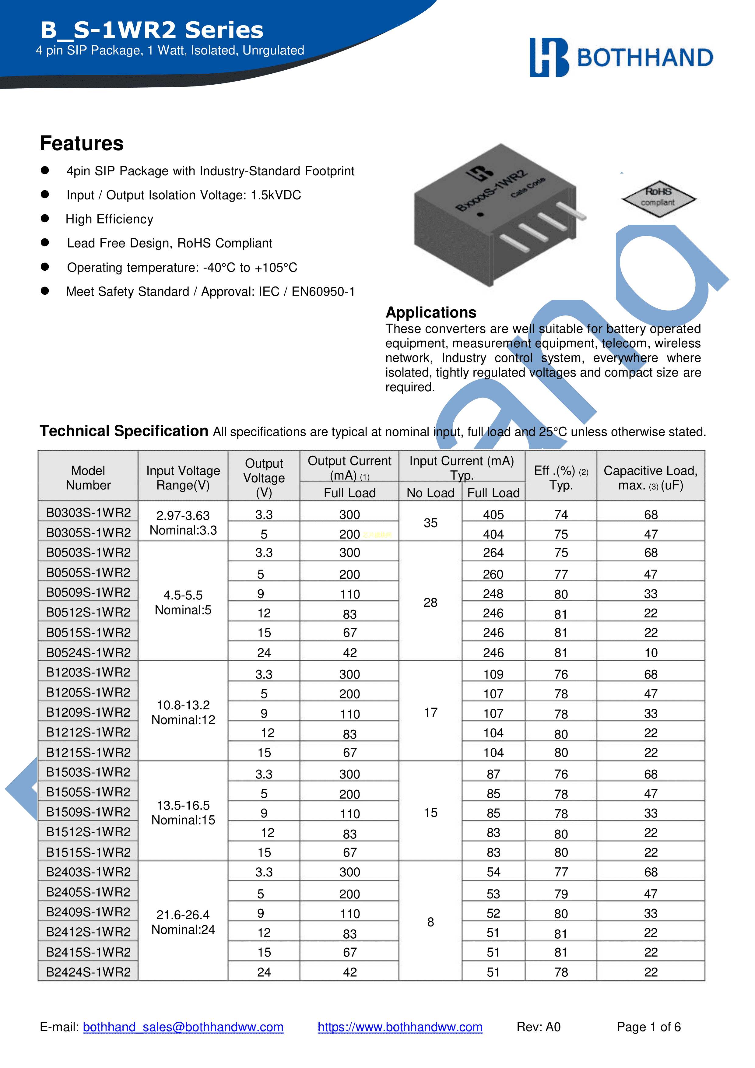 B1212S-1WR2数据手册SIP-4封装BOTHHAND(帛汉)PDF规格书,中英文下载