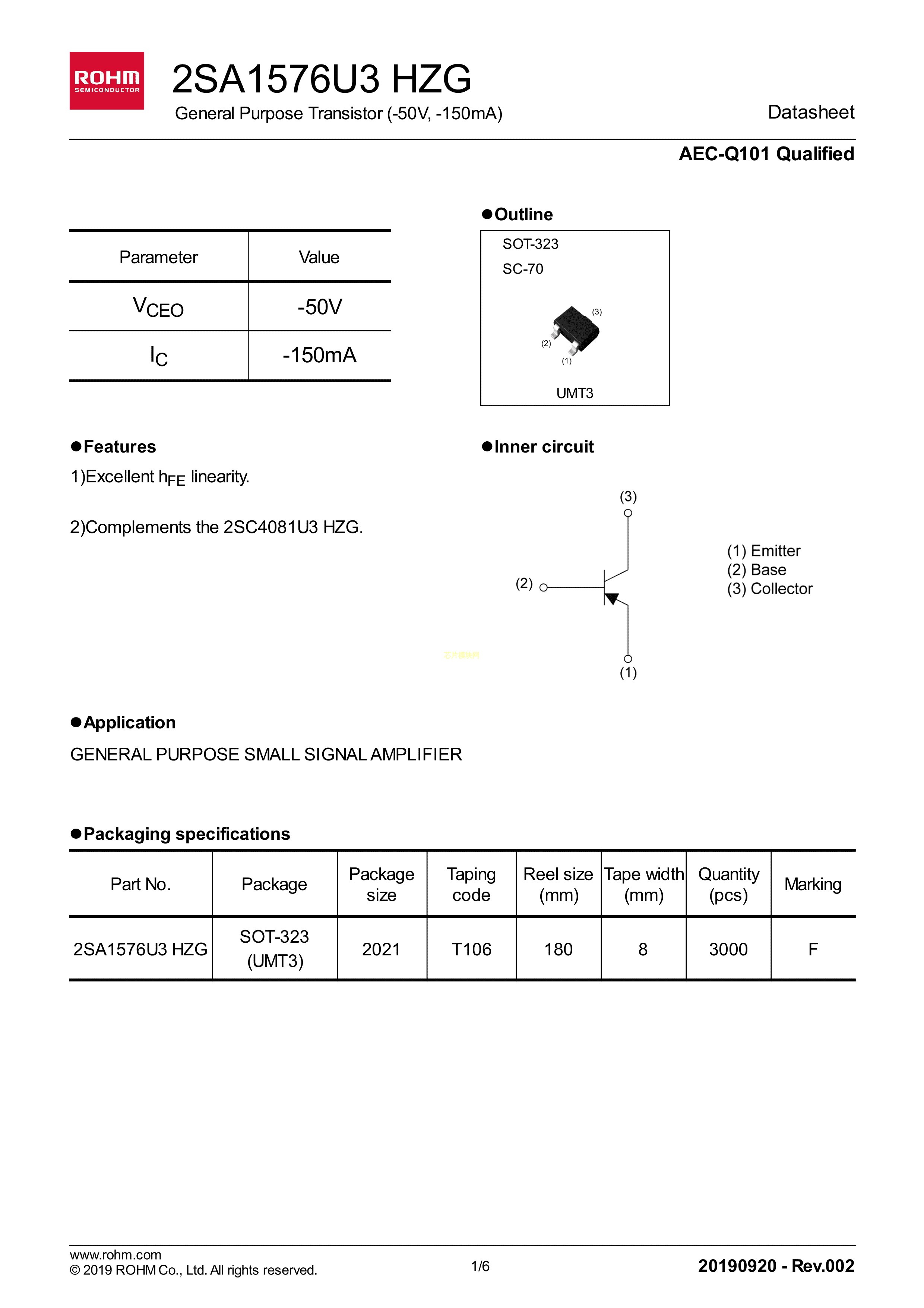 2SA1576U3HZGT106R数据手册SOT-323-3封装ROHM(罗姆)PDF规格书,中英文