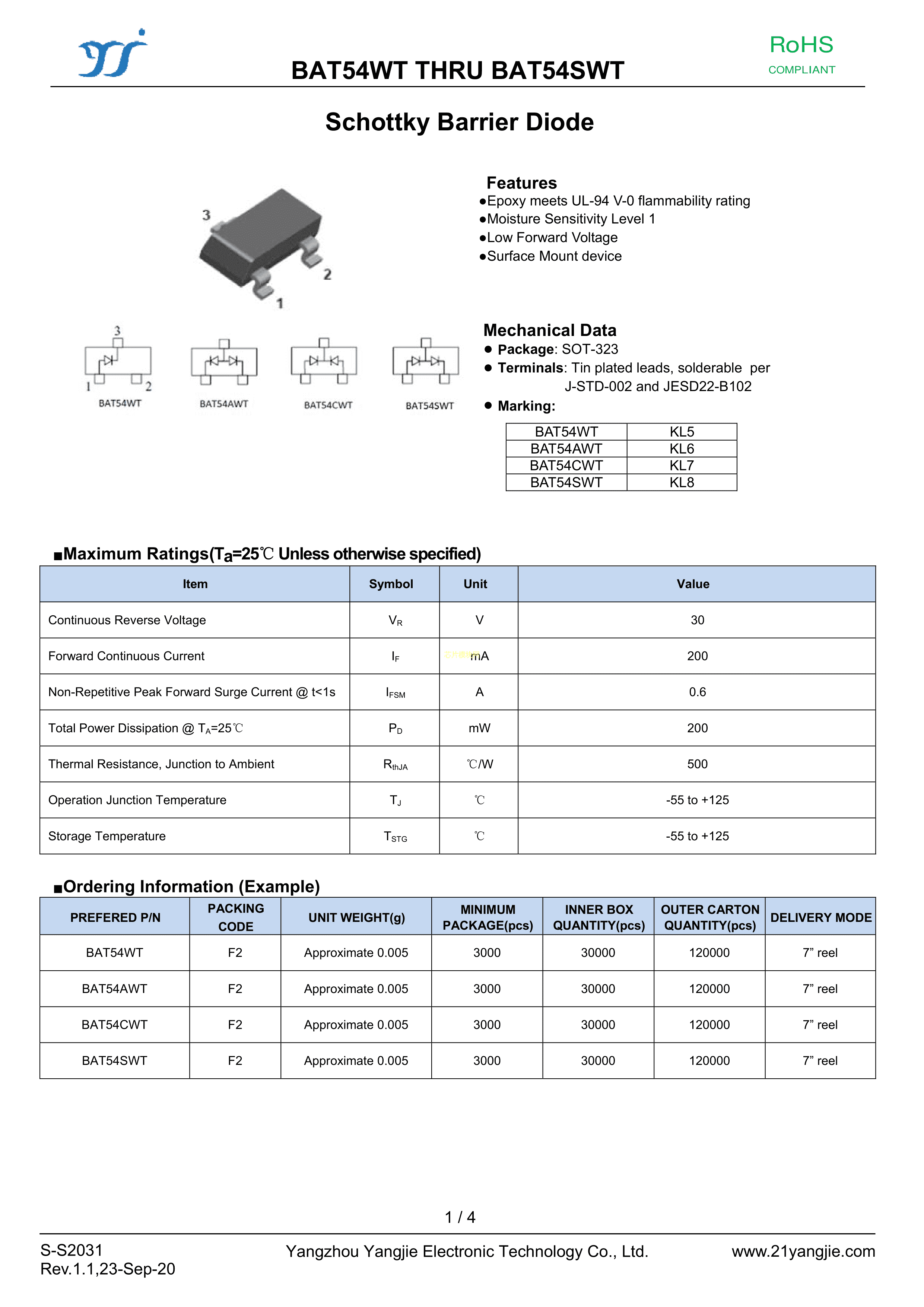 BAT54CWT数据手册SOT-323封装YANGJIE(扬杰)PDF规格书,中英文下载