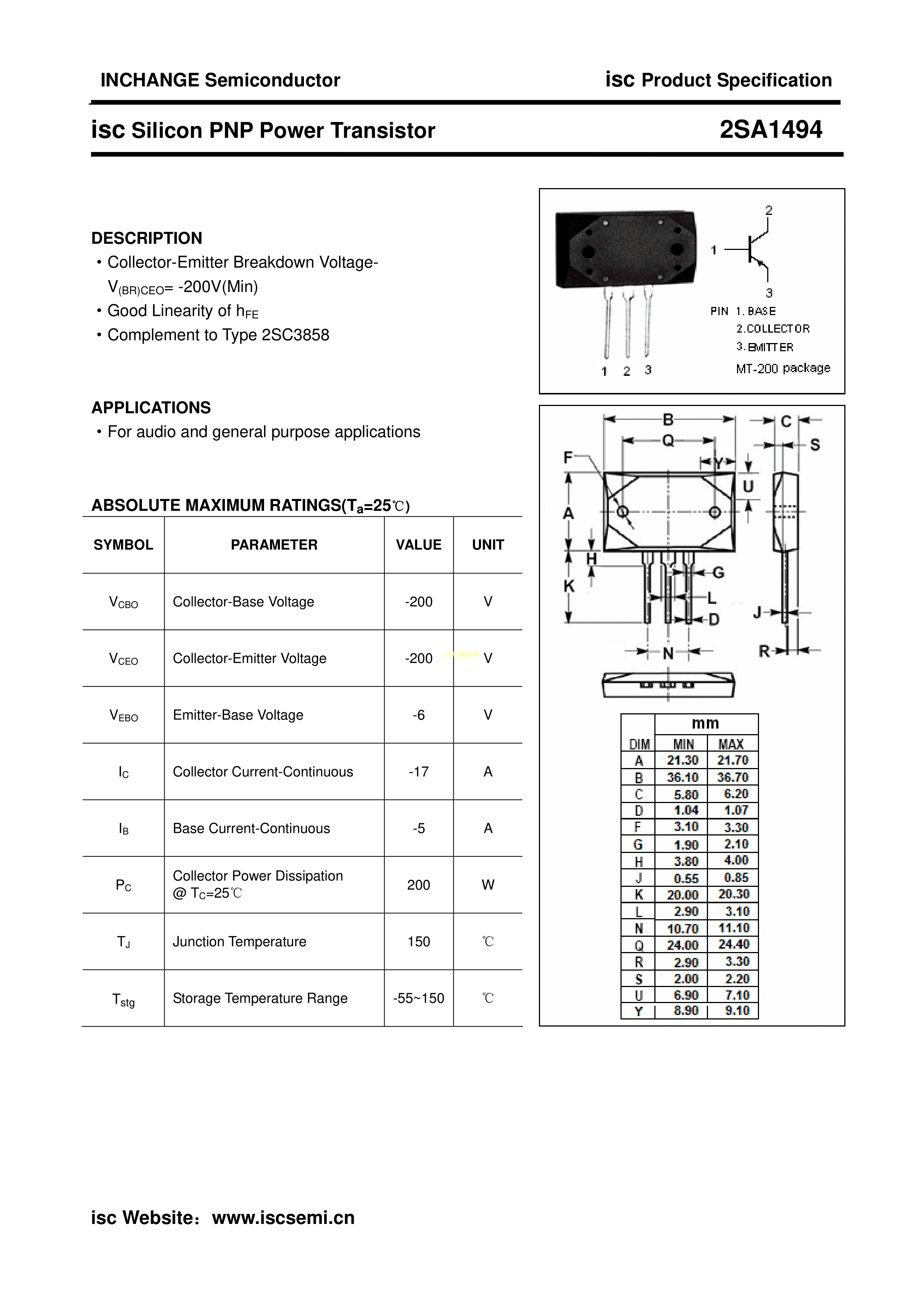 2SA1494数据手册TO-MT-200封装ISC(无锡固电)PDF规格书,中英文下载