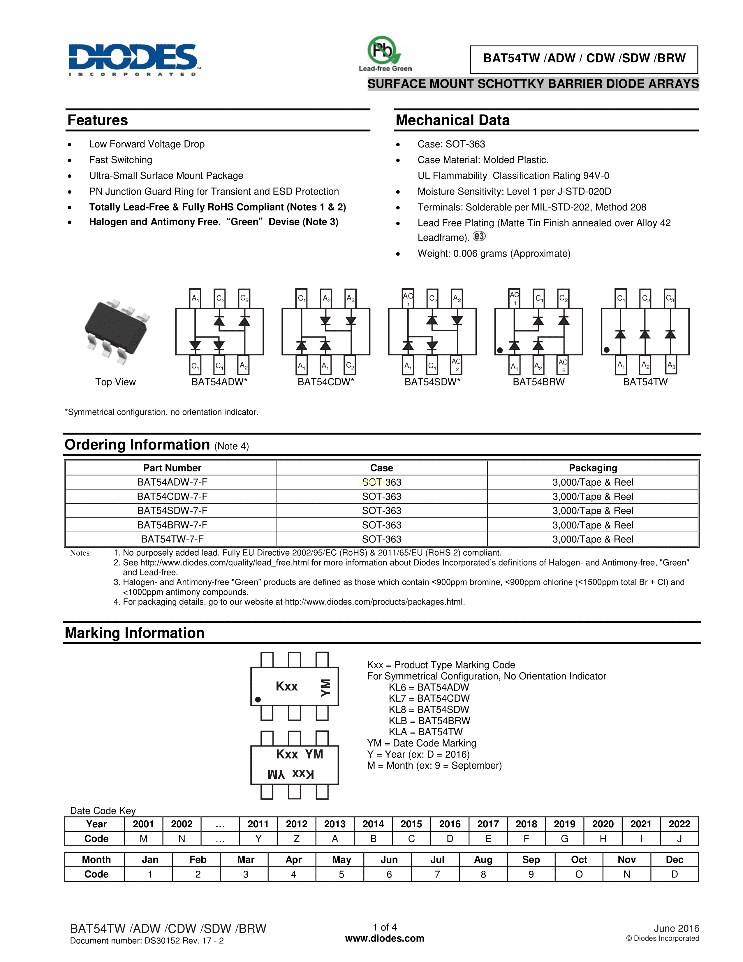 BAT54CDW-7-F数据手册SC-70-6(SOT-363)封装DIODES(美台)PDF规格书