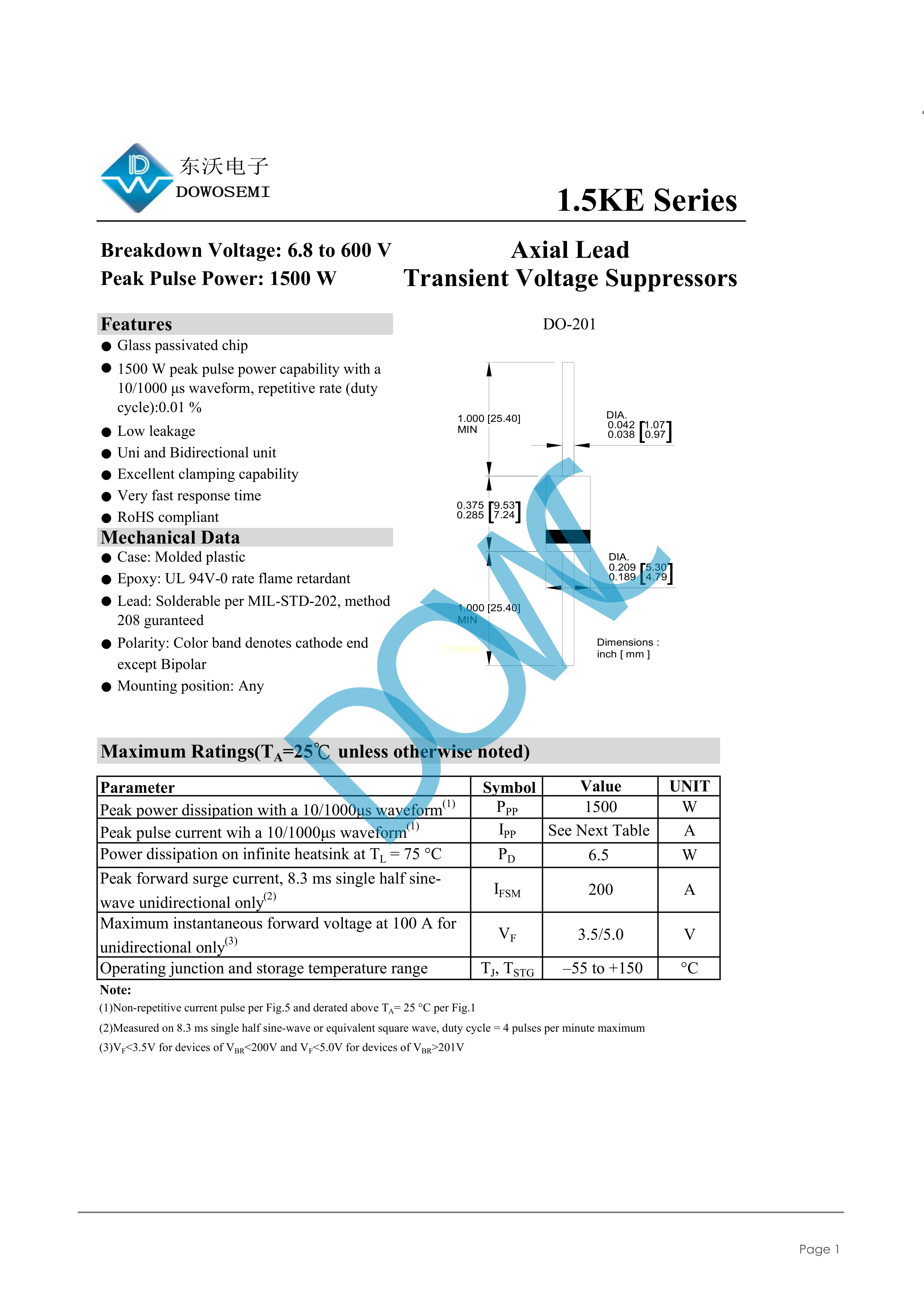 1.5KE6.8A数据手册DO-201封装DOWO(东沃)PDF规格书,中英文下载