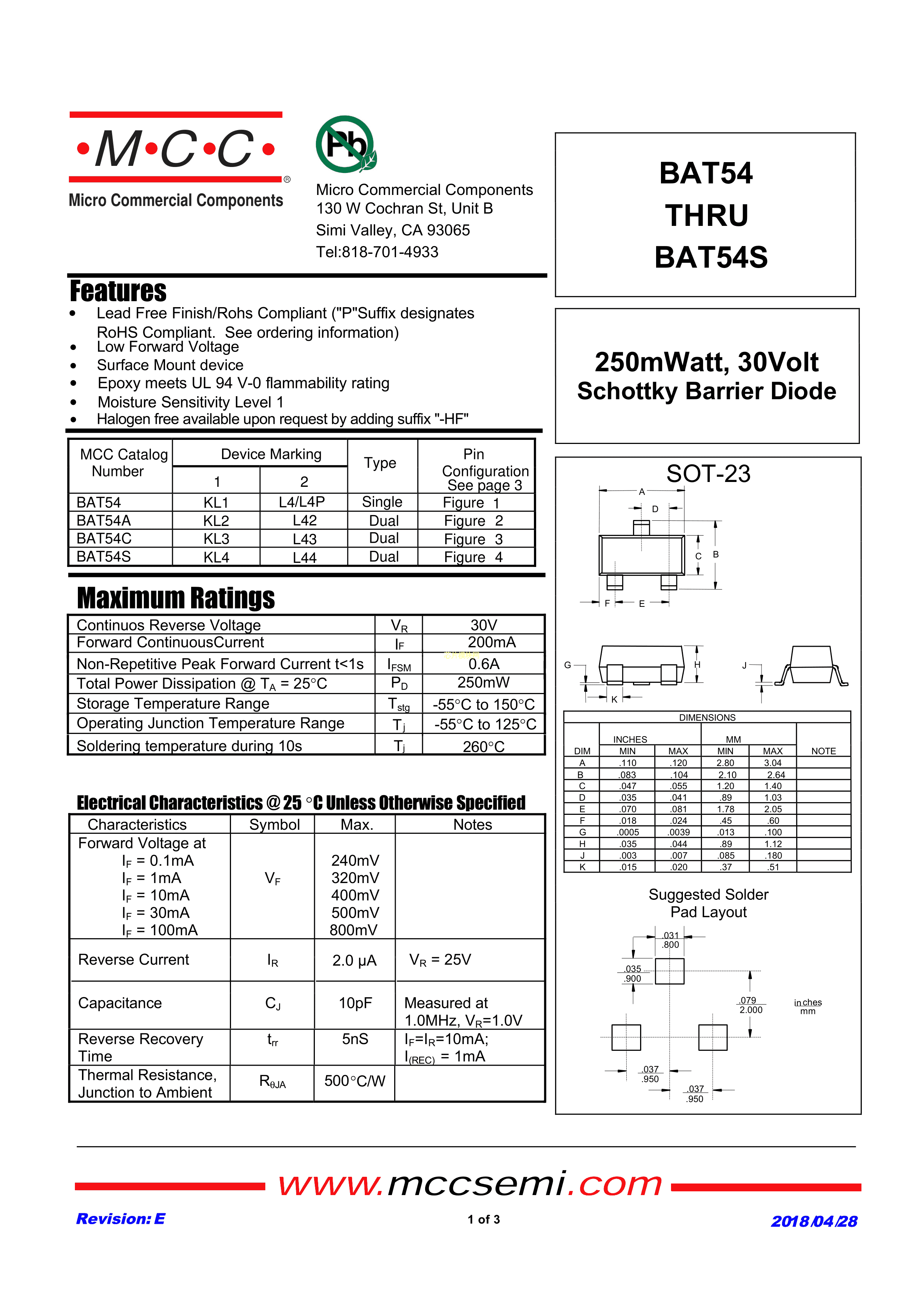 BAT54C-TP数据手册SOT-23封装MCC(美微科)PDF规格书,中英文下载