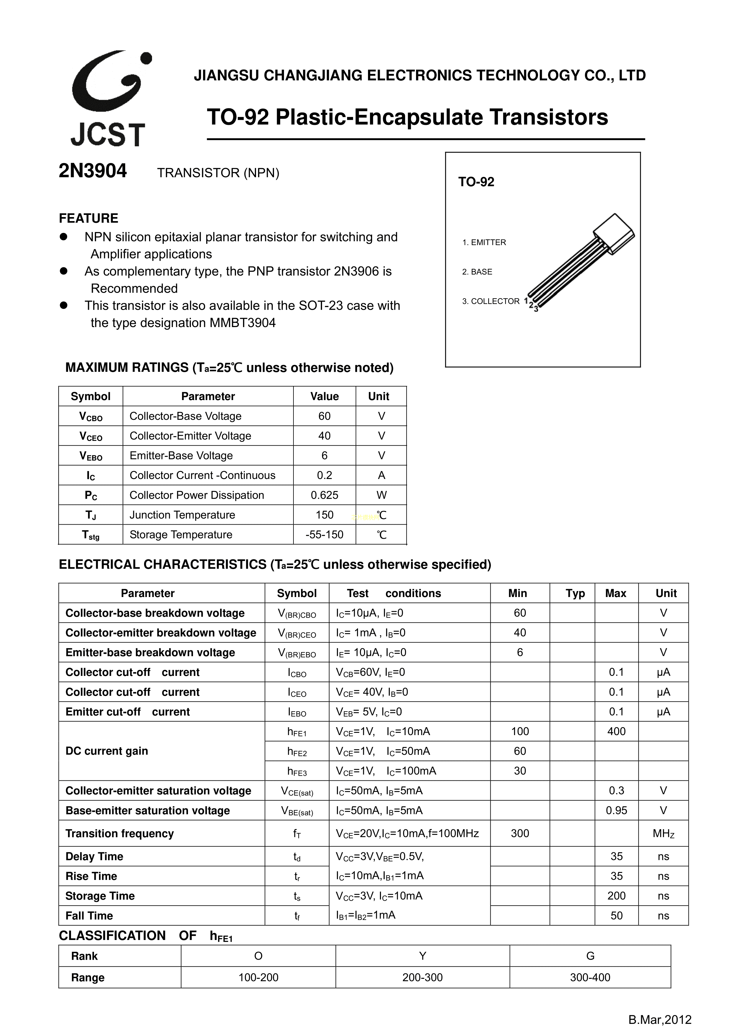 2N3904数据手册TO-92封装CJ(江苏长电-长晶)PDF规格书,中英文下载