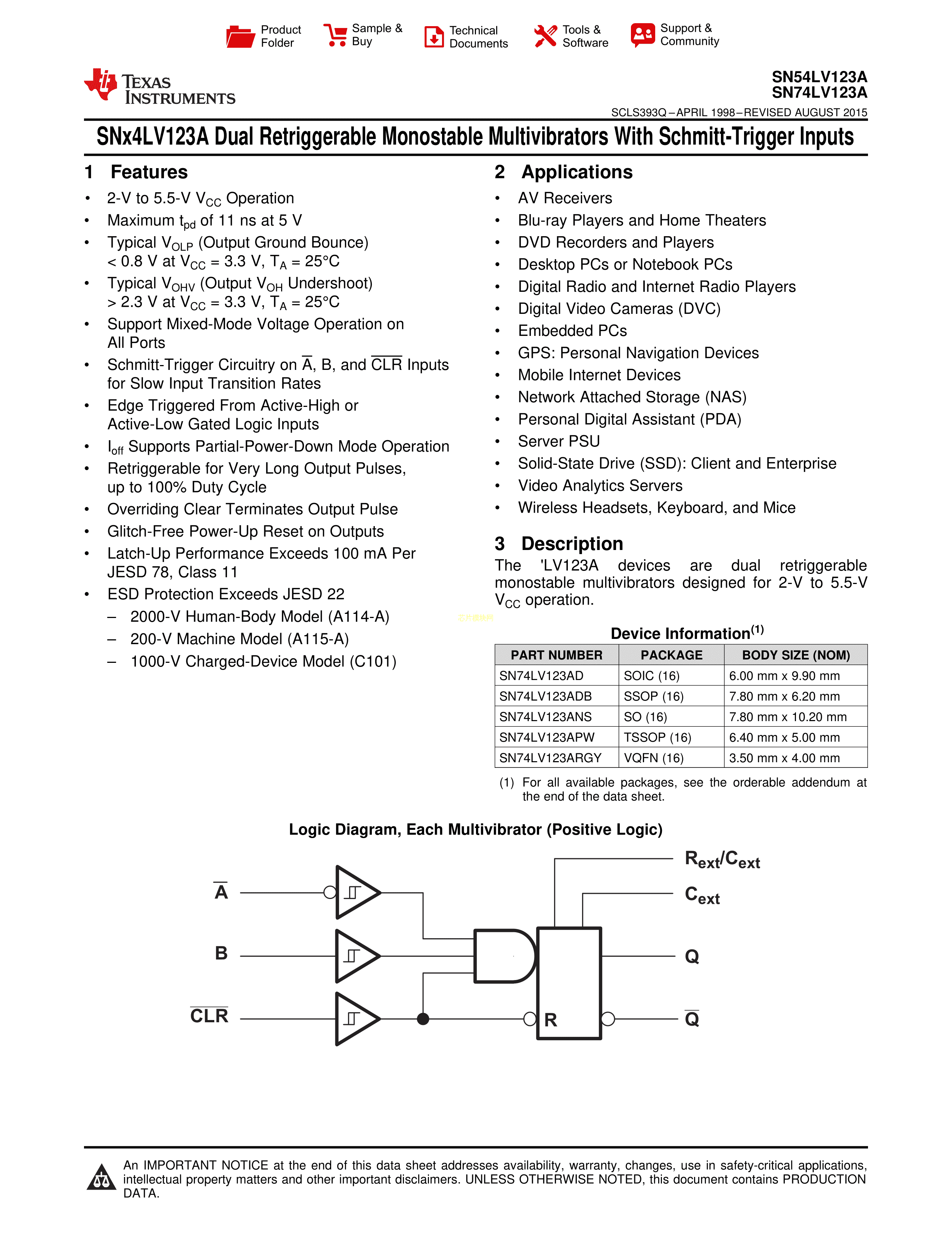 SN74LV123ARGYR数据手册VQFN-16封装TI(德州仪器)PDF规格书,中英文下载