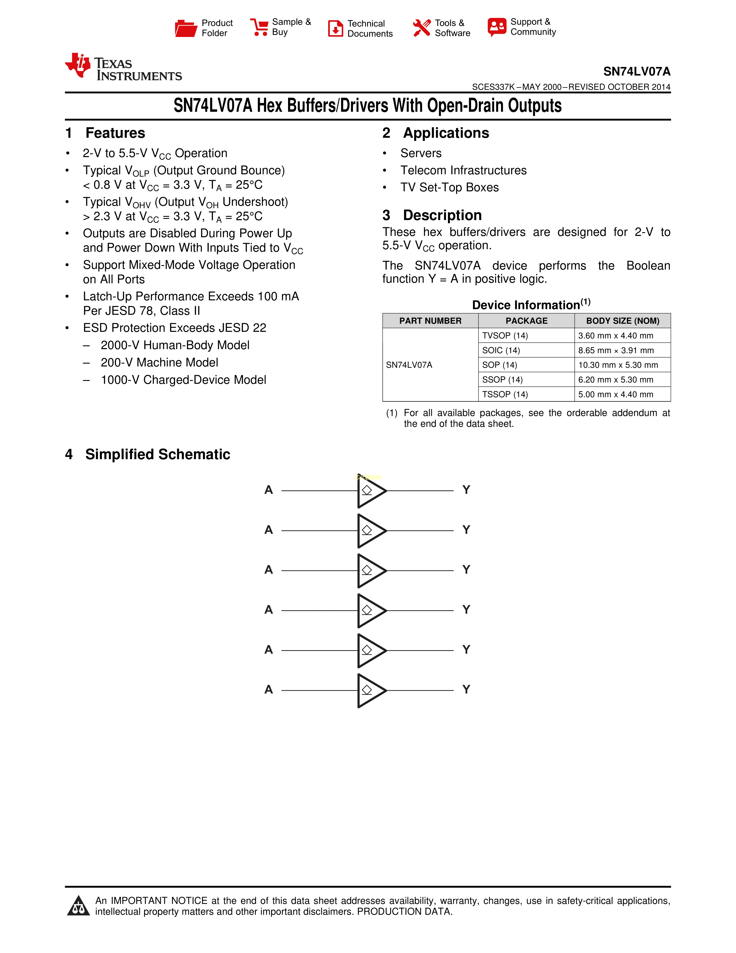 SN74LV07APWR数据手册TSSOP-14封装TI(德州仪器)PDF规格书,中英文下载