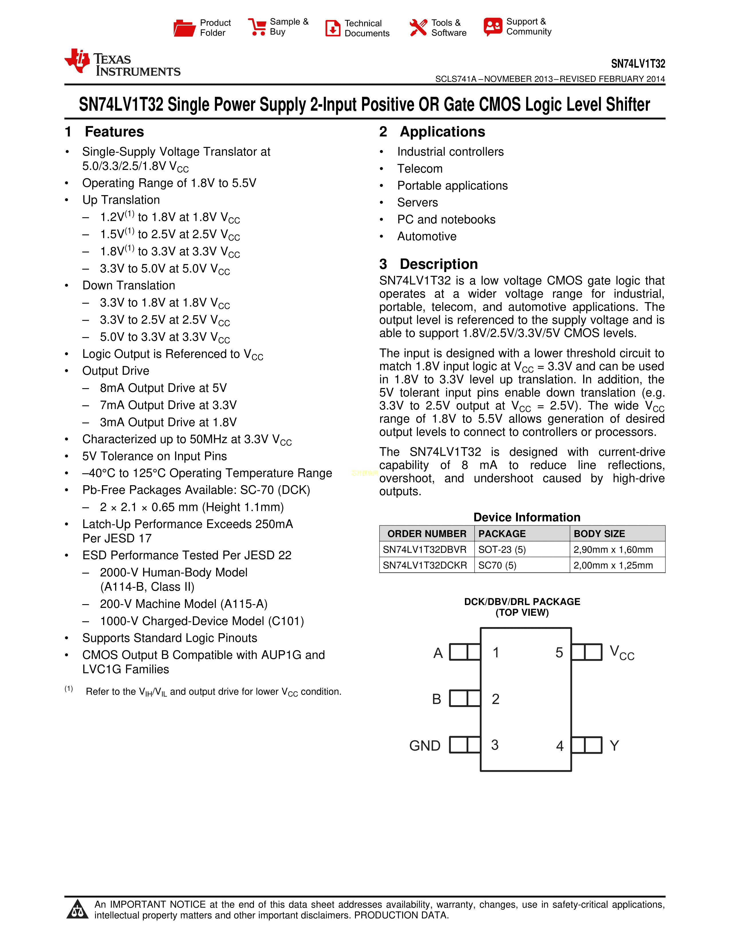 SN74LV1T32DCKR数据手册SC-70-5封装TI(德州仪器)PDF规格书,中英文下载