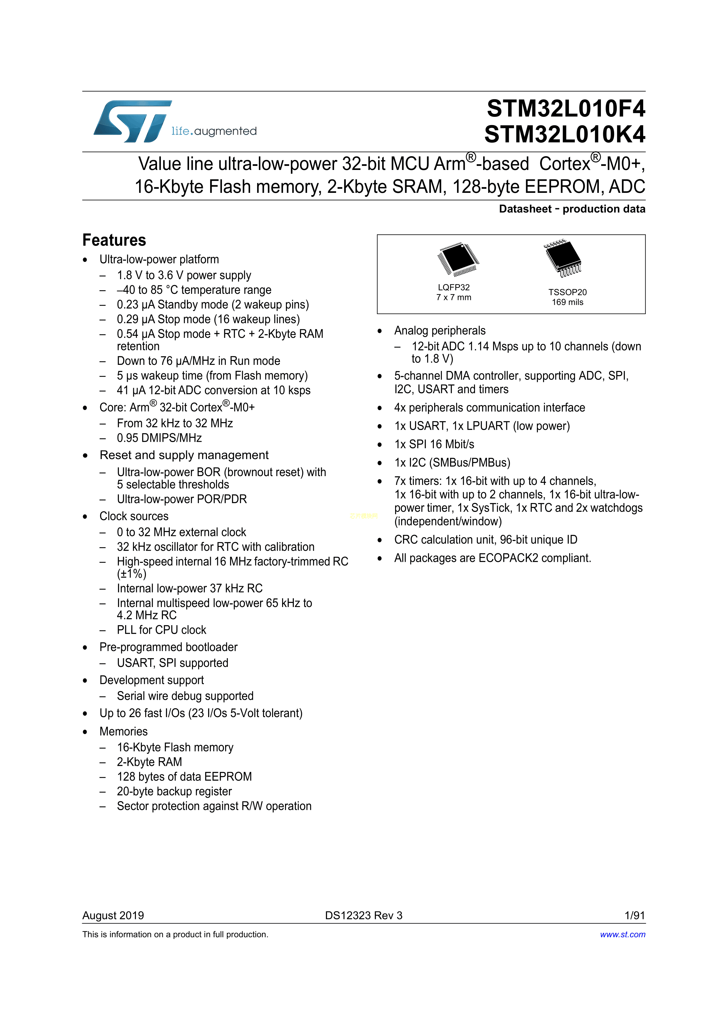 STM32L010K8T6数据手册LQFP-32封装ST(意法半导体)PDF规格书,中英文下载