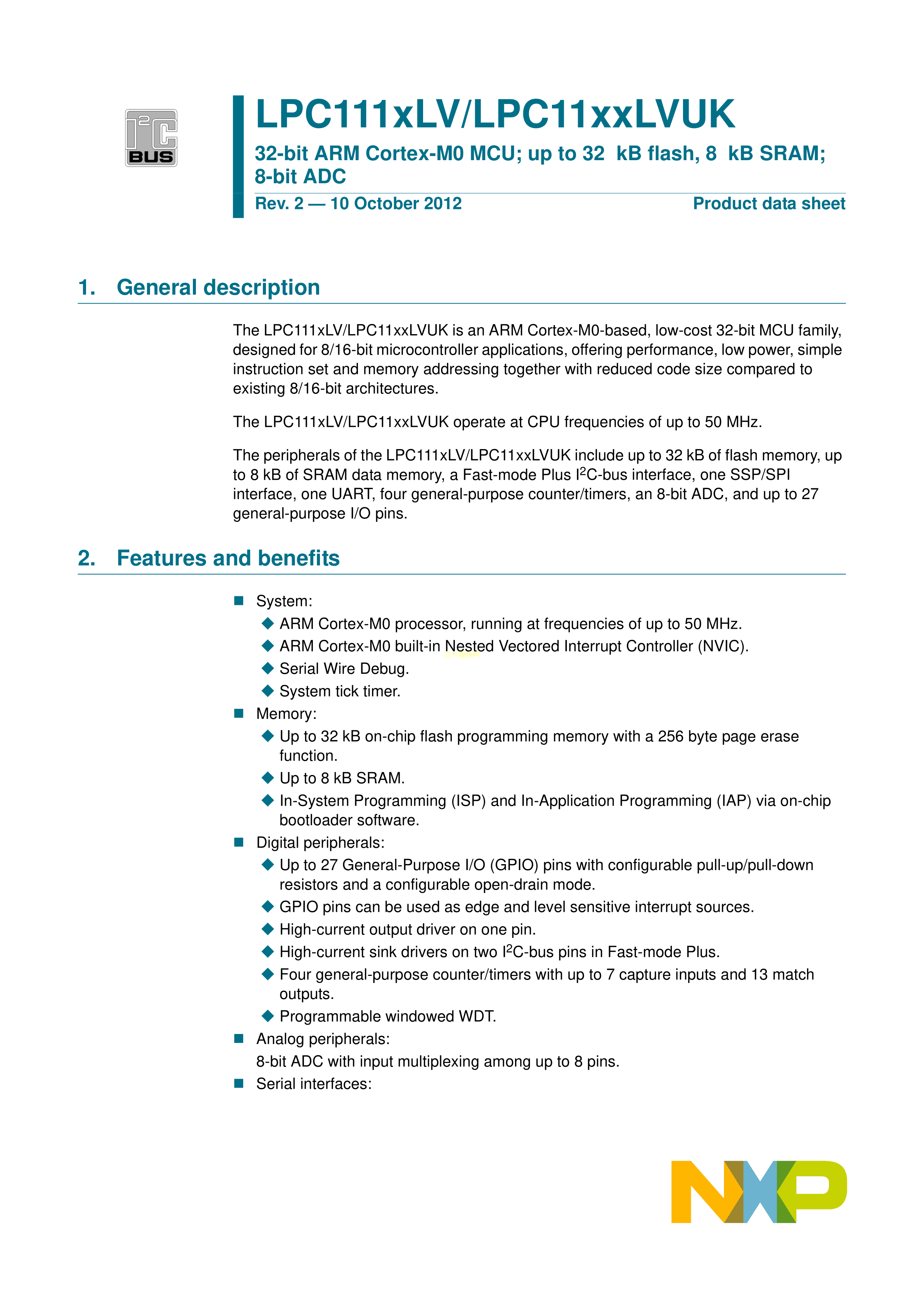 LPC1112LVFHI33-103数据手册HVQFN-33(7x7)封装NXP(恩智浦)PDF规格