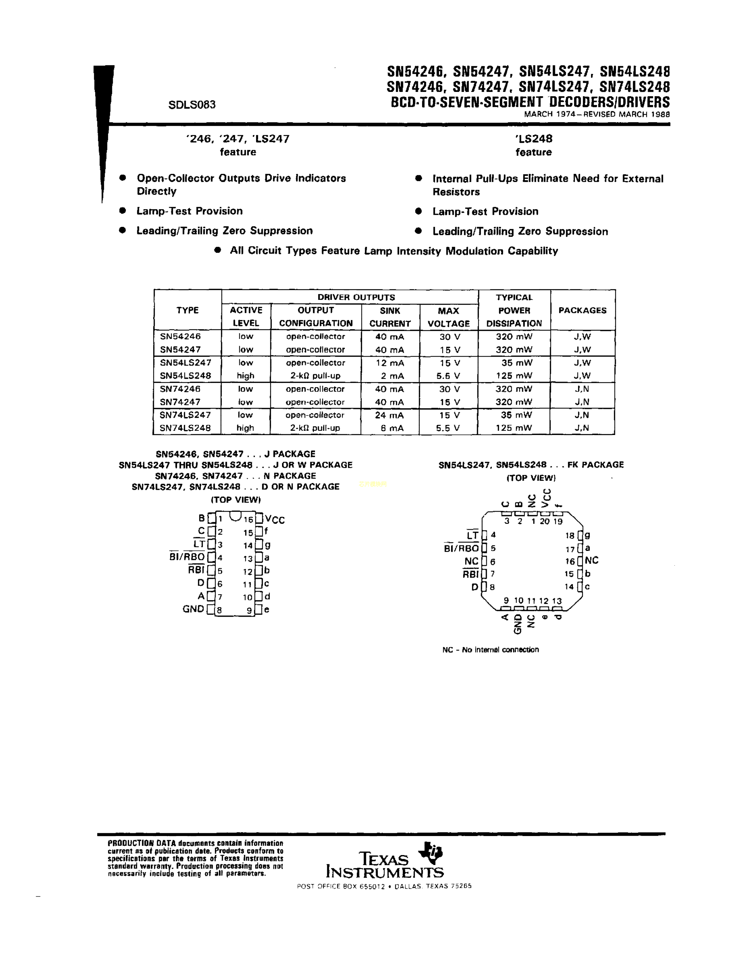 SN74LS247N数据手册DIP-16封装TI(德州仪器)PDF规格书,中英文下载