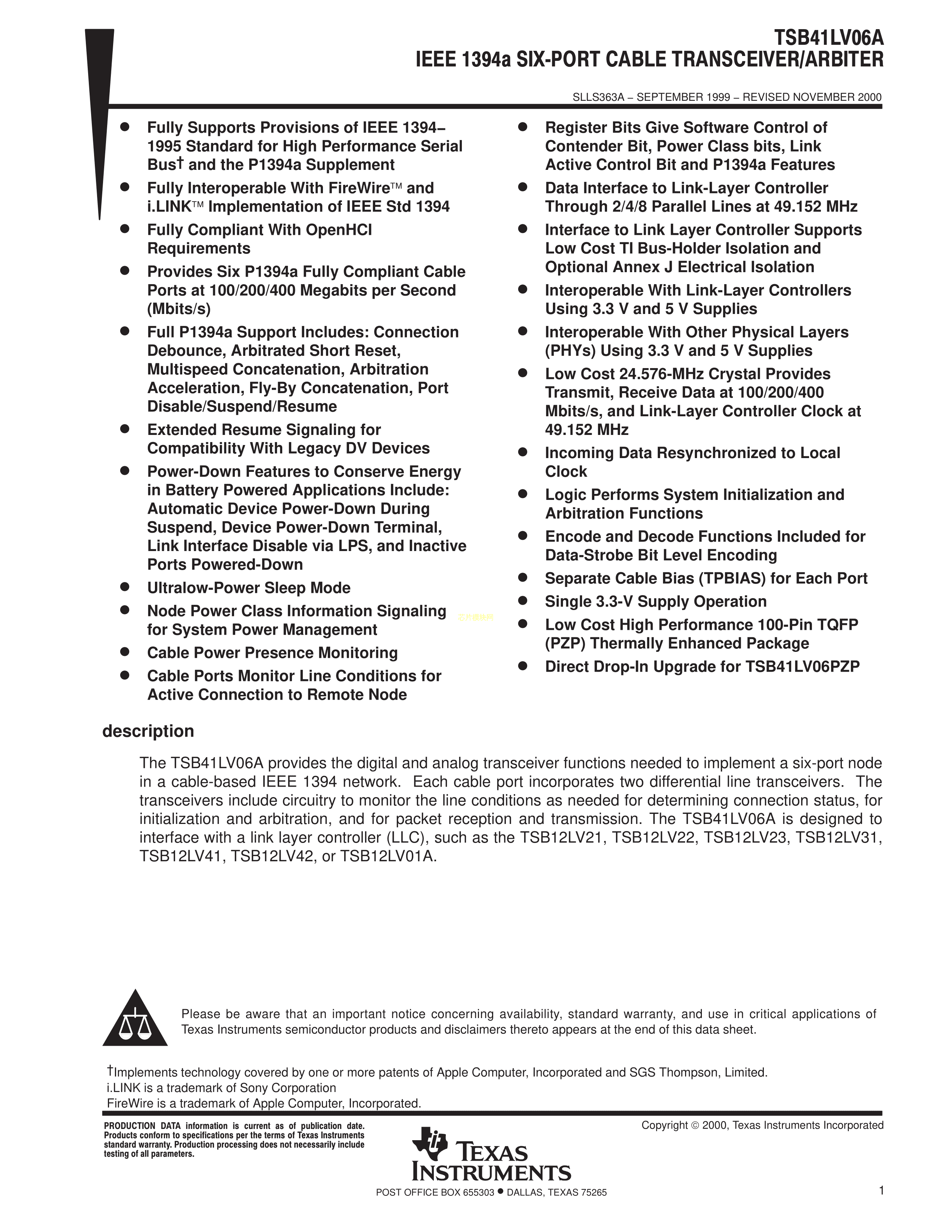 TSB41LV06APZP数据手册HTQFP-100(14x14)封装TI(德州仪器)PDF规格书,
