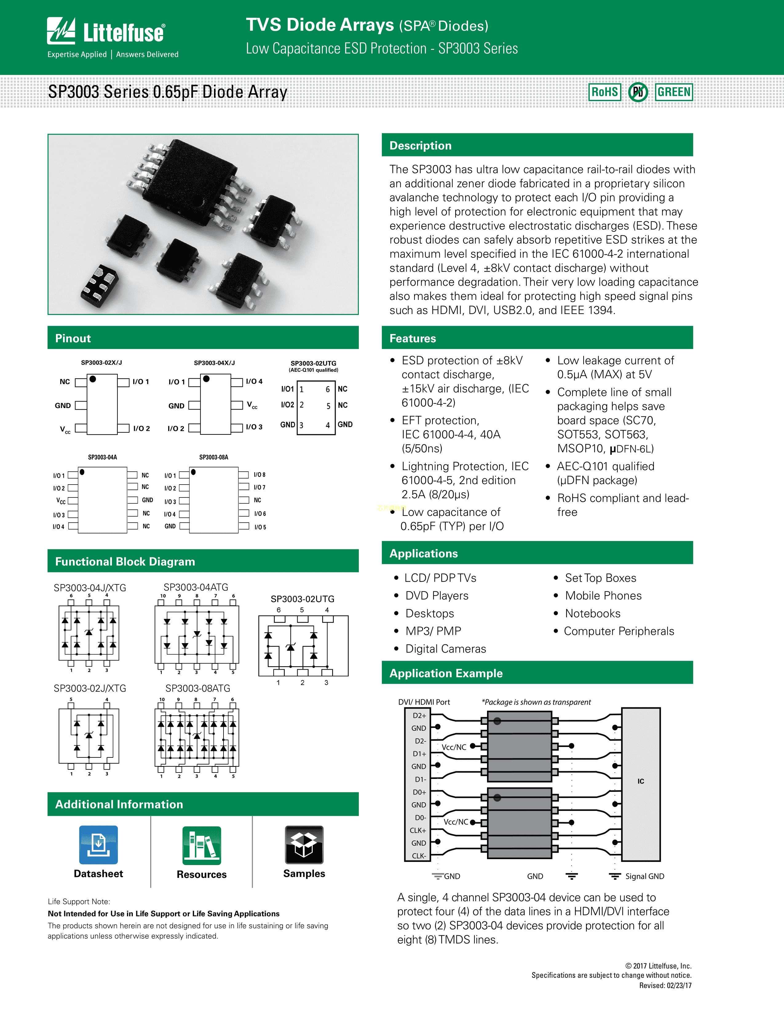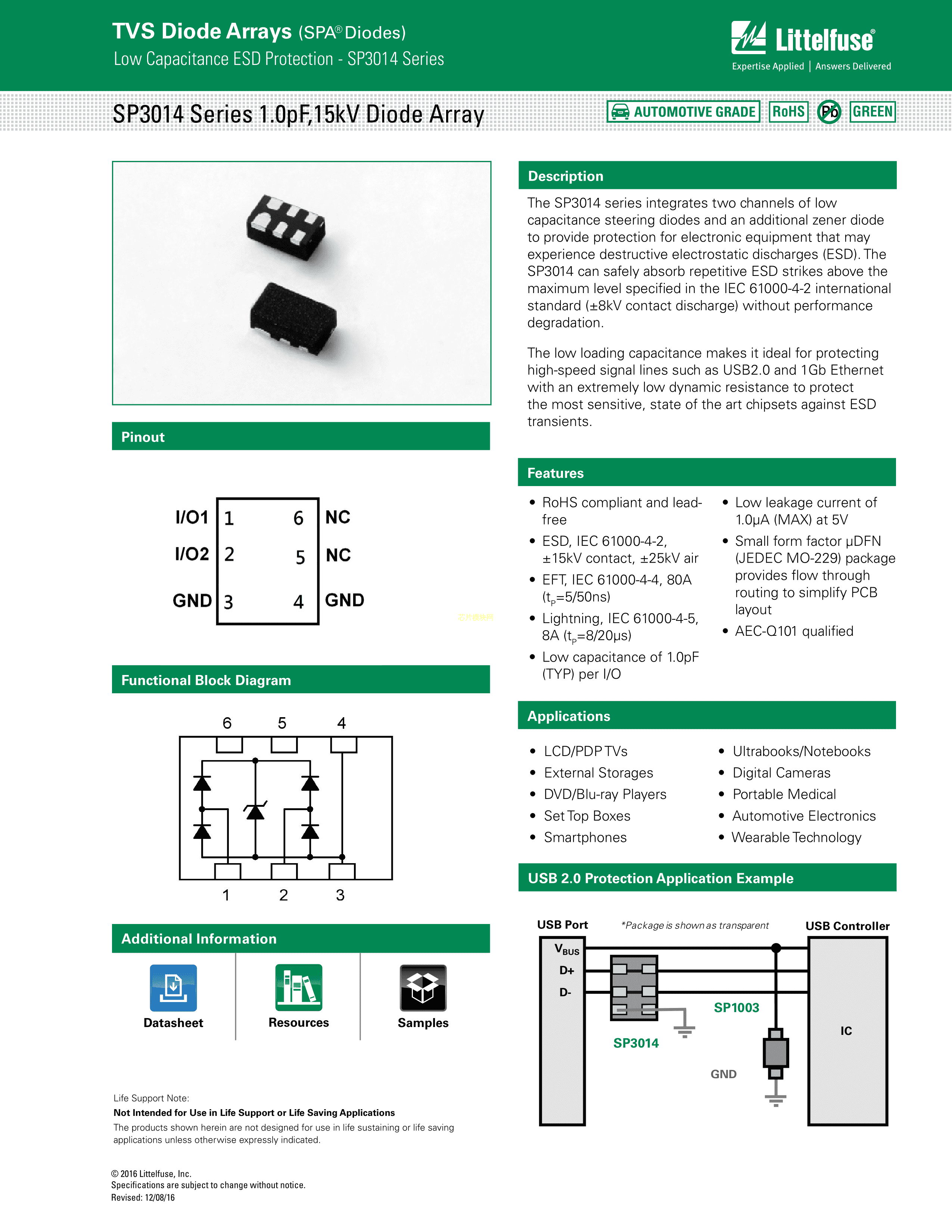 SP3014-02UTG数据手册uDFN-6封装Littelfuse(美国力特)PDF规格书,中英文下载