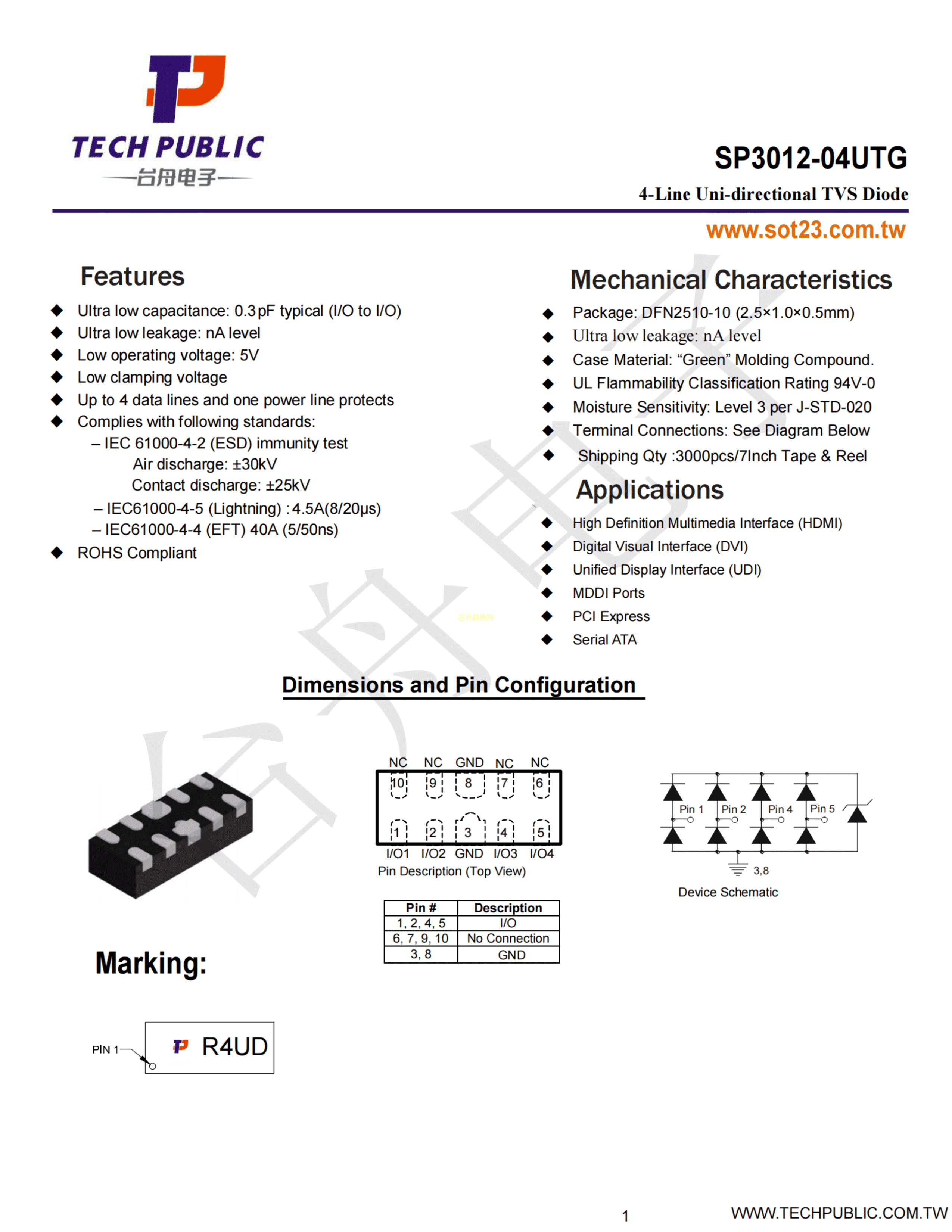 SP3012-04UTG数据手册DFN2510-10封装TECHPUBLIC(台舟)PDF规格书,中英文下载