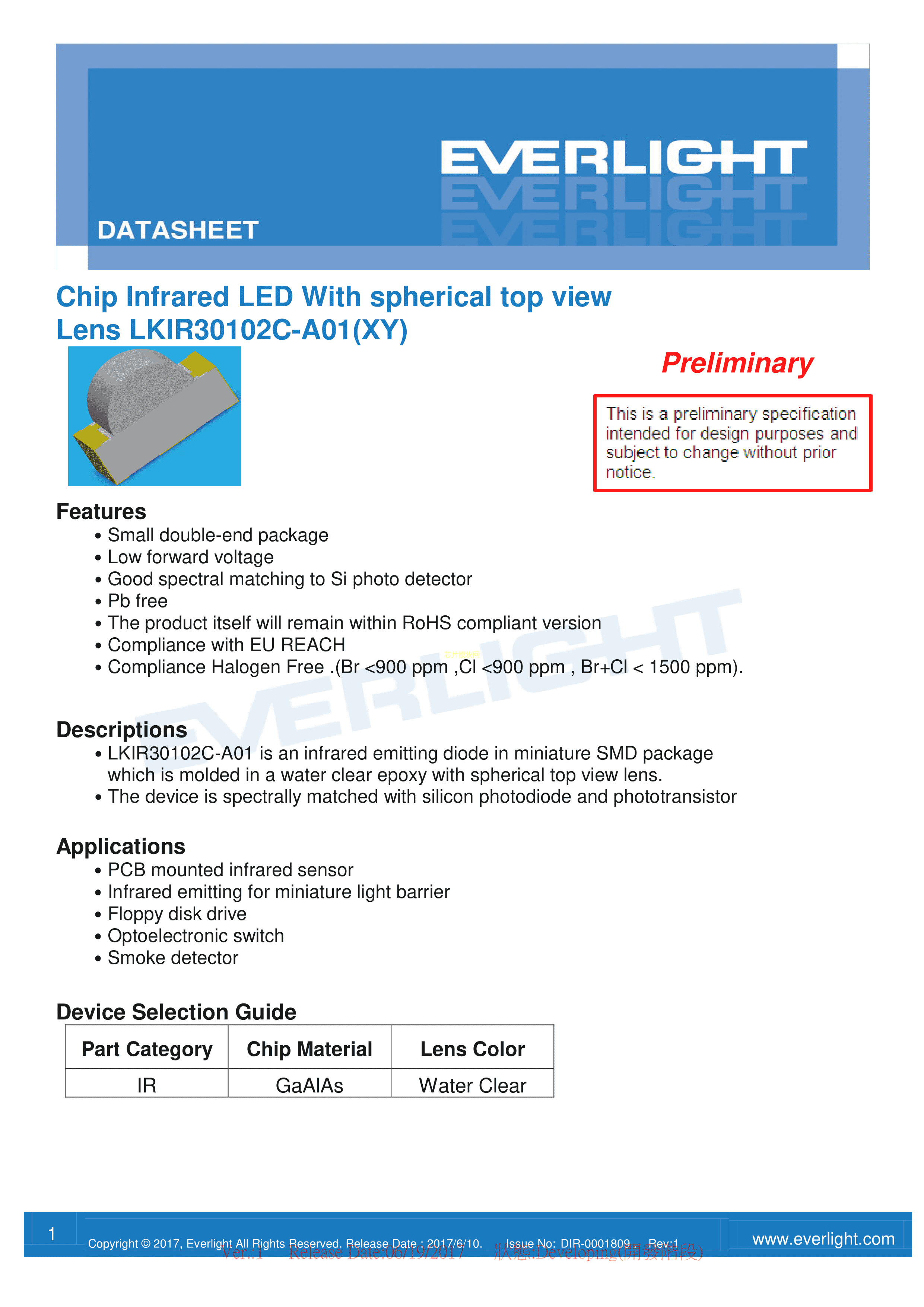 LKIR30102C-A01(XY)数据手册SMD封装EVERLIGHT(台湾亿光)PDF规格书,中英文下载