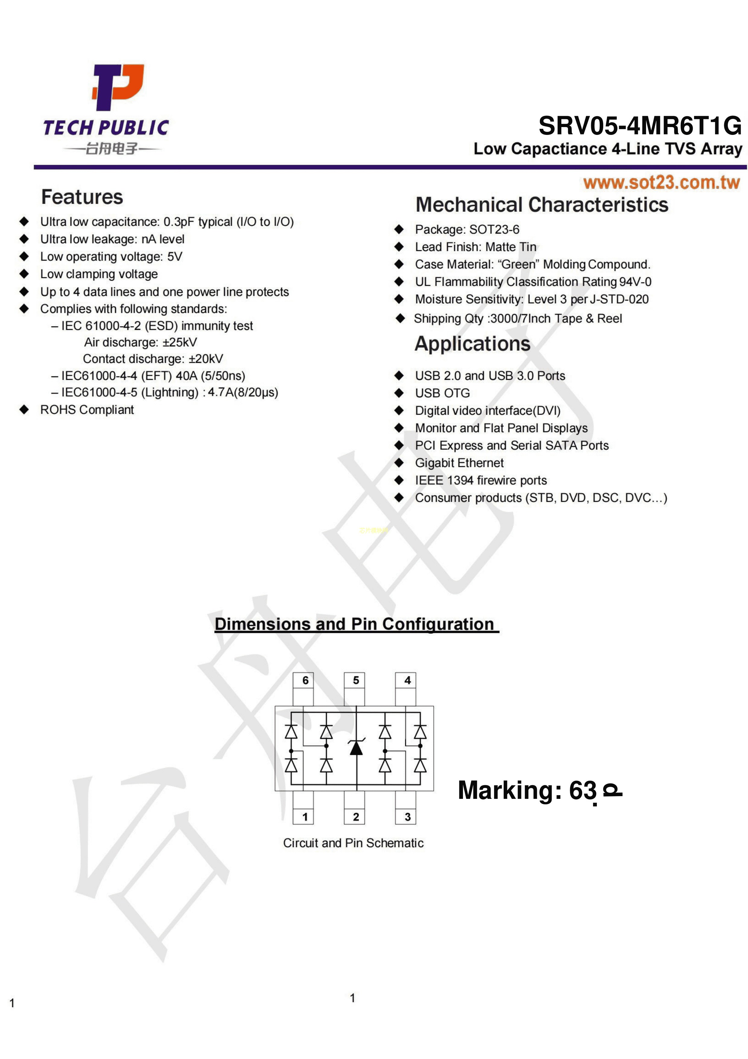 SRV05-4MR6T1G数据手册SOT-23-6封装TECHPUBLIC(台舟)PDF规格书,中英文下载