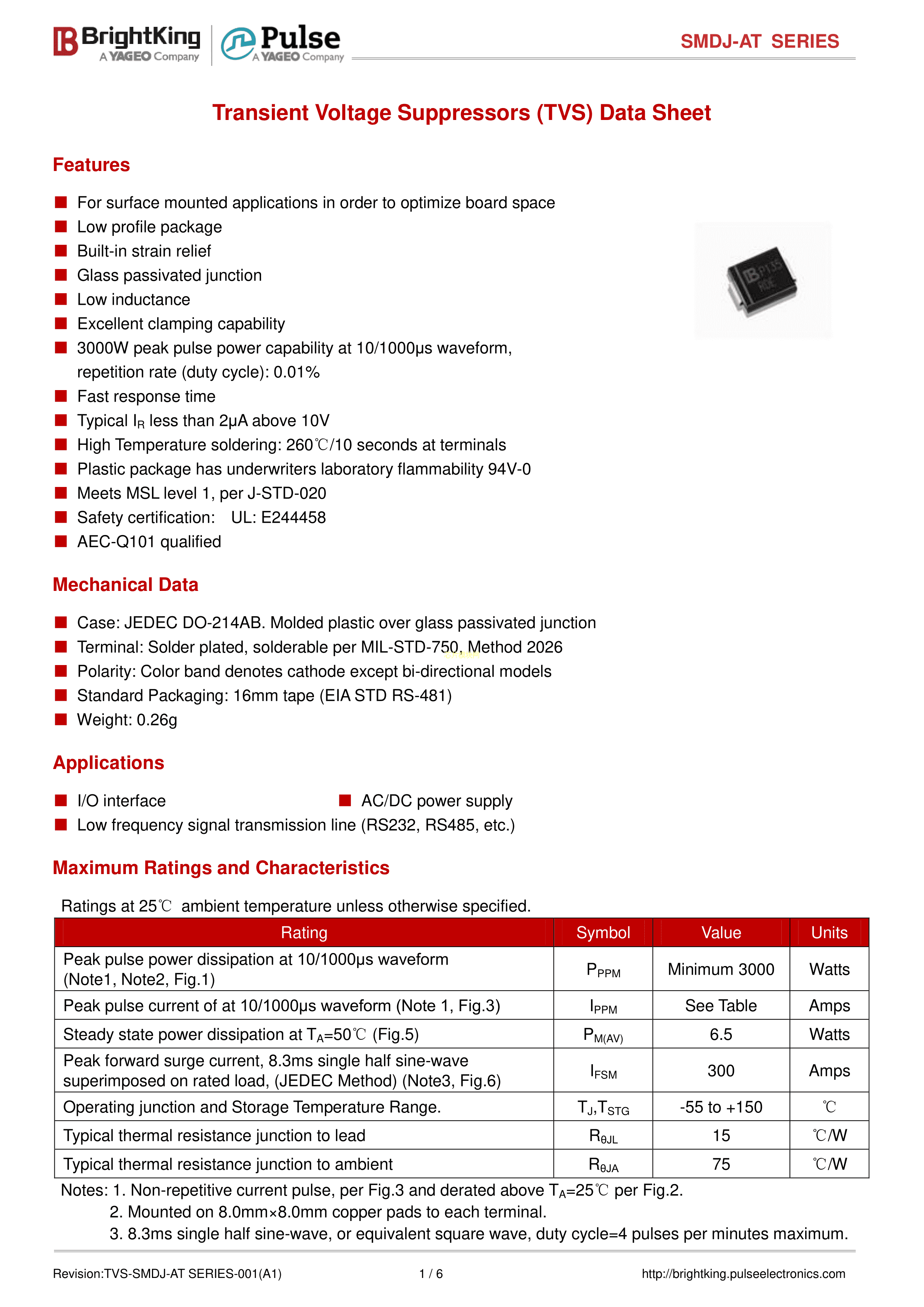SMDJ24CA-AT数据手册SMC(DO-214AB)封装Brightking(台湾君耀)PDF规格书,中英文下载