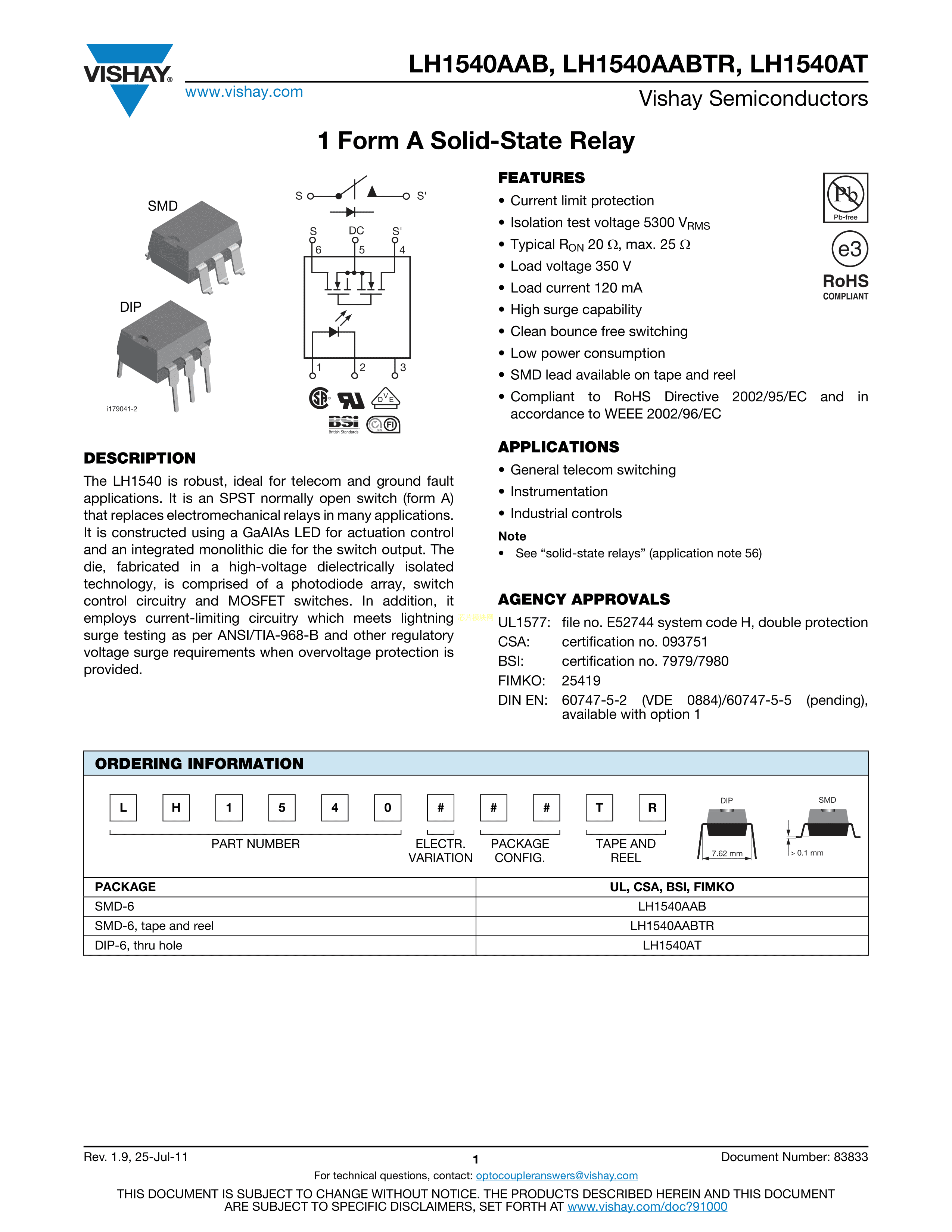 LH1540AABTR数据手册SMD-6封装VISHAY(威世)PDF规格书,中英文下载