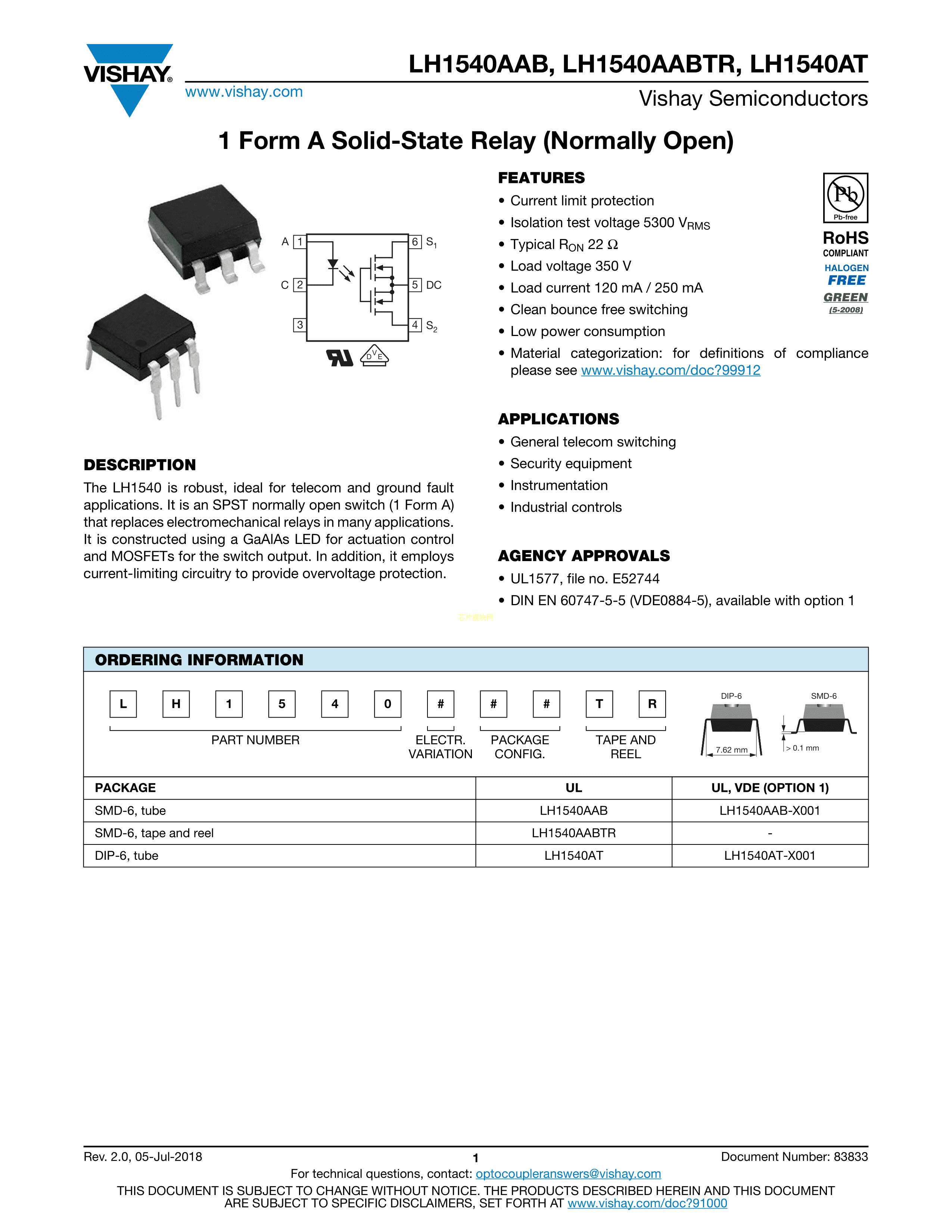 LH1540AAB数据手册SMD-6封装VISHAY(威世)PDF规格书,中英文下载