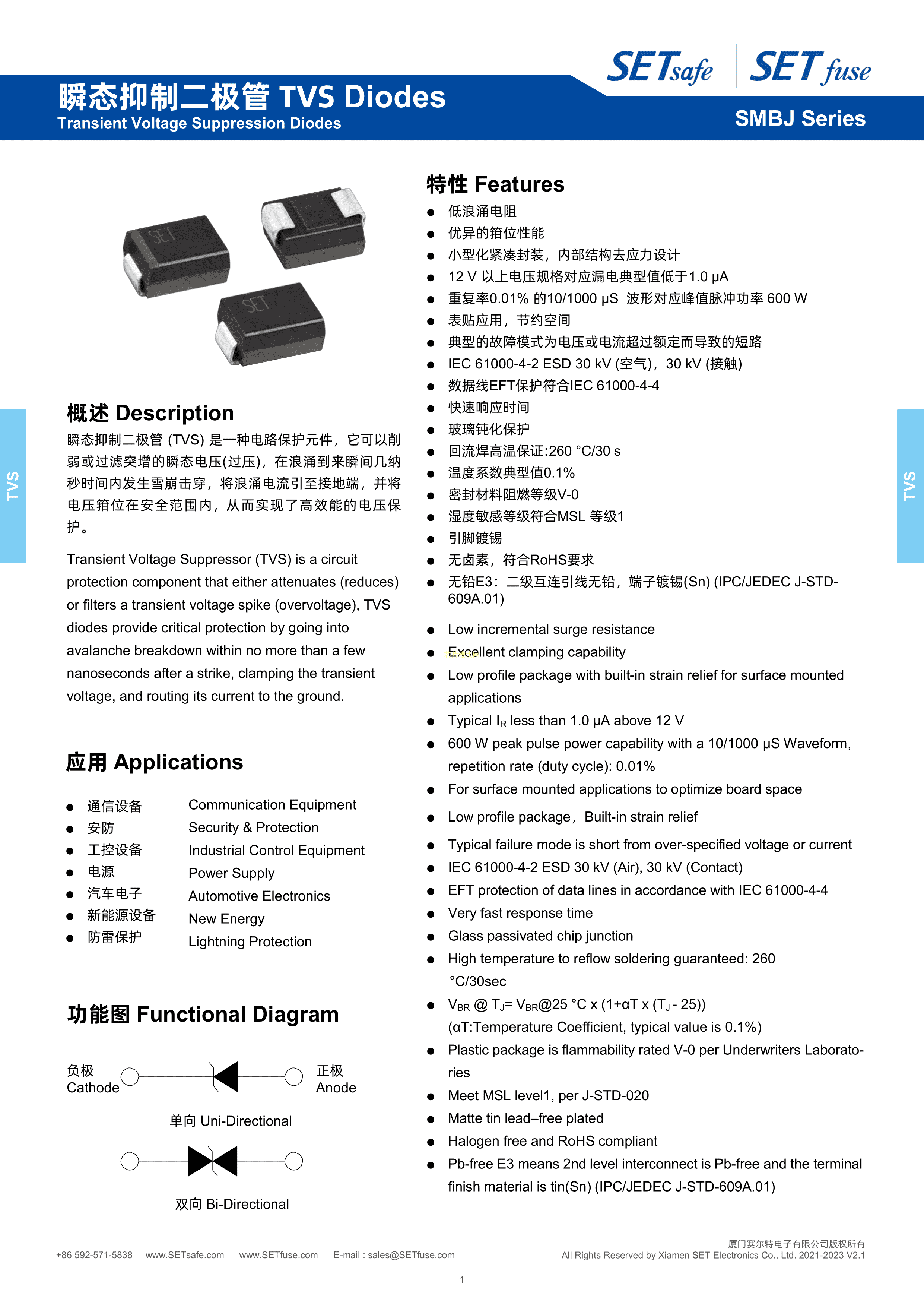 SMBJ33CA数据手册SMB封装SET(赛尔特)PDF规格书,中英文下载