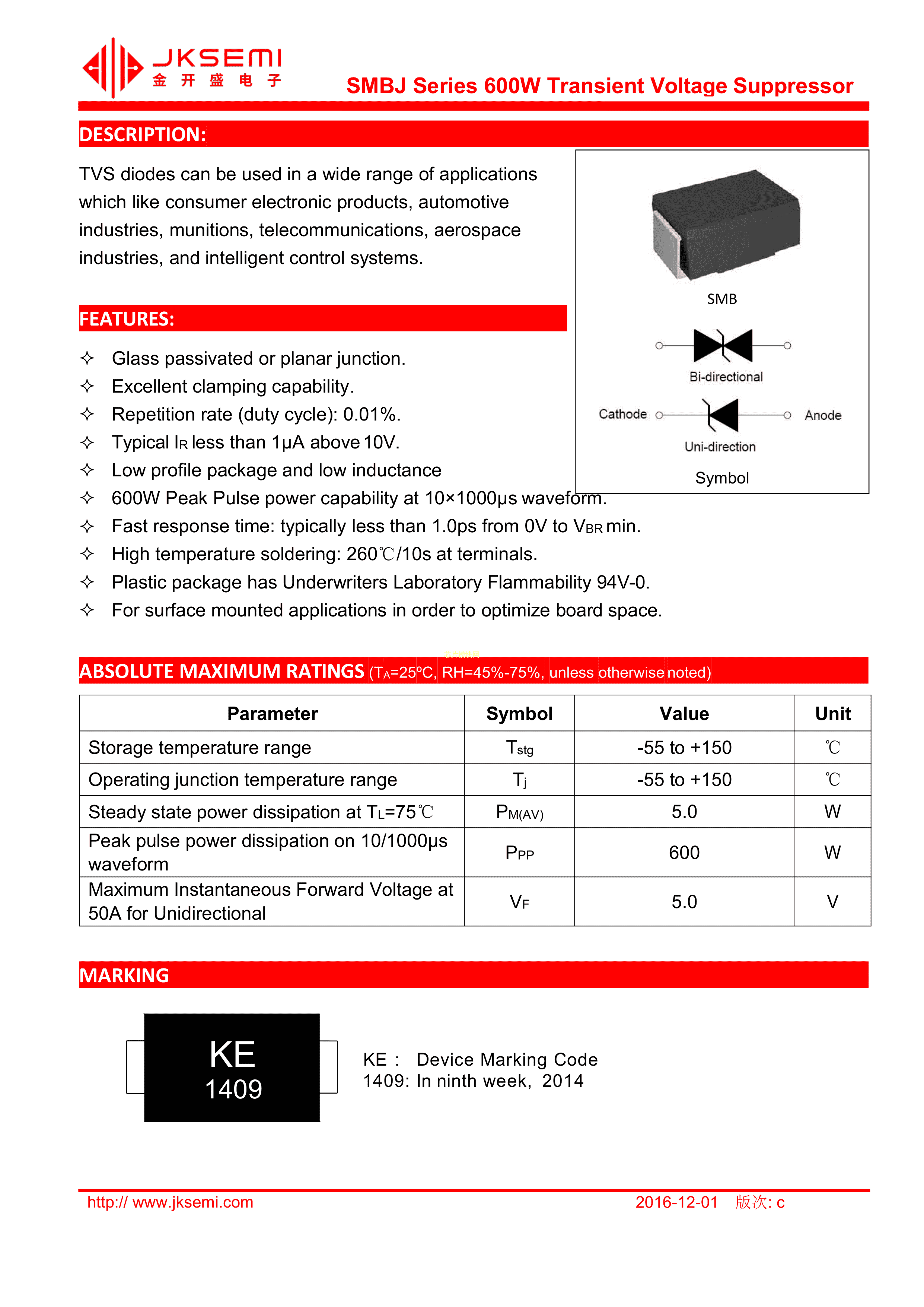 SMBJ40CA数据手册SMB(DO-214AA)封装JKSEMI(金开盛)PDF规格书,中英文下载