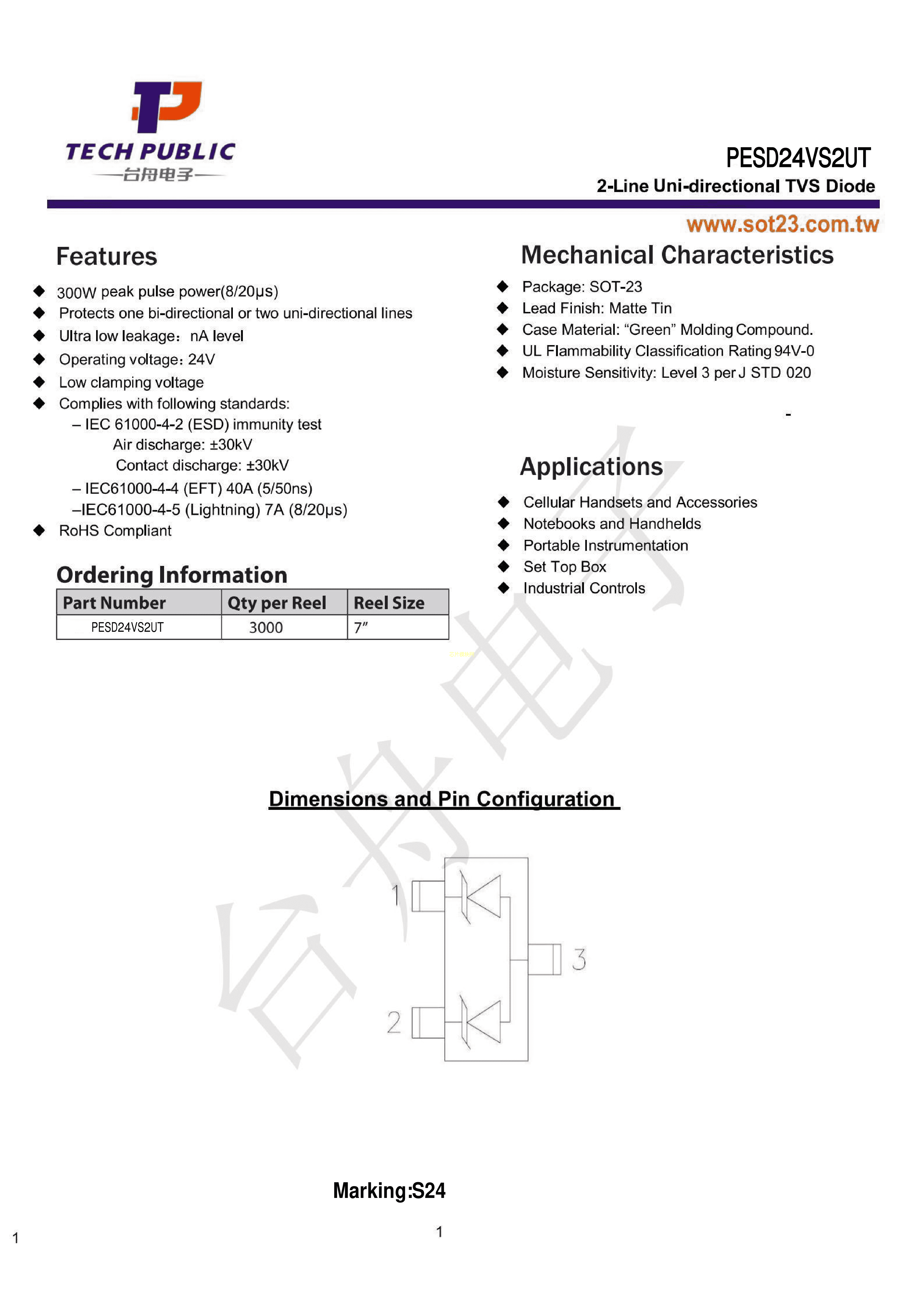 PESD24VS2UT数据手册SOT-23封装TECHPUBLIC(台舟)PDF规格书,中英文下载