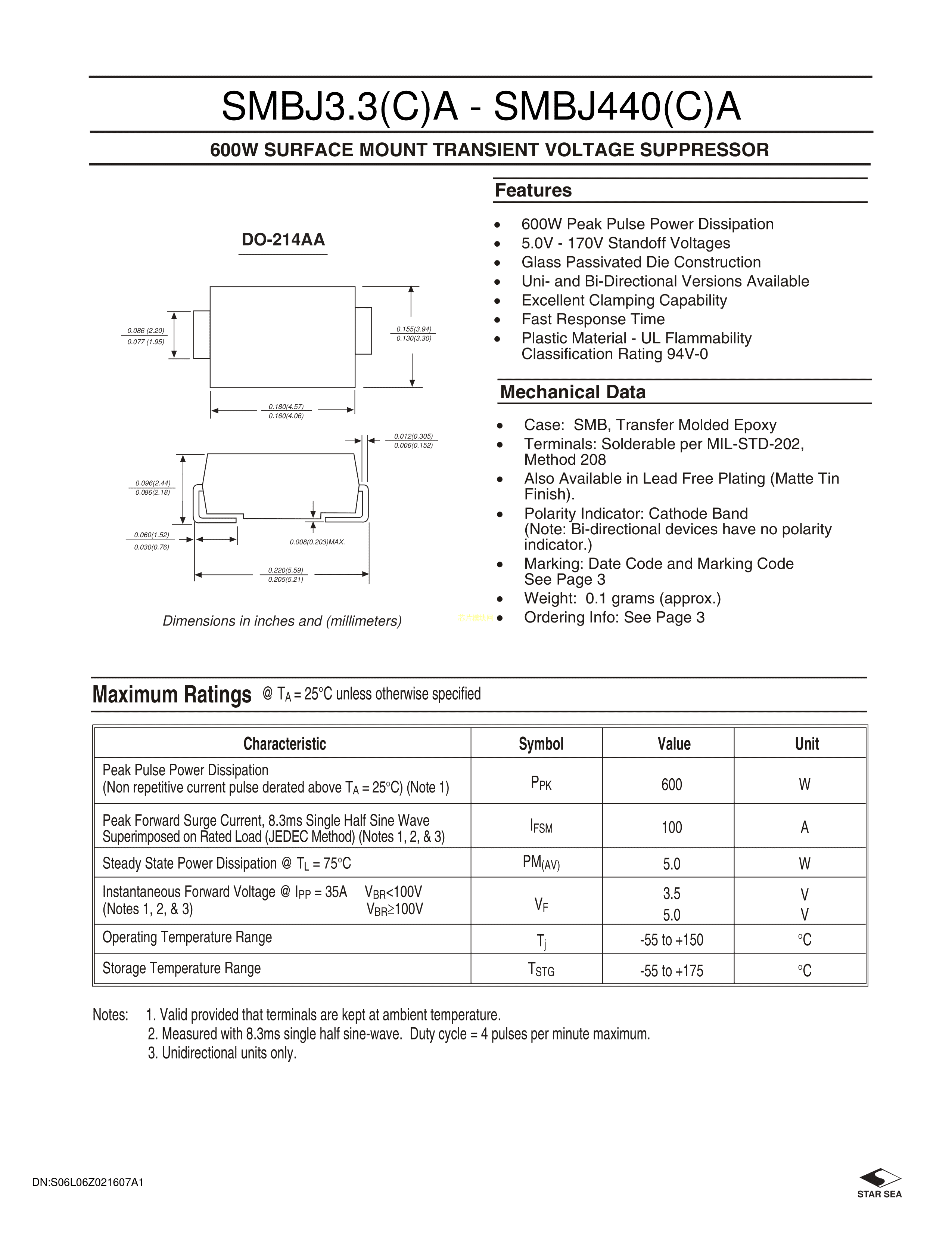 SMBJ33CA数据手册SMB(DO-214AA)封装星海PDF规格书,中英文下载