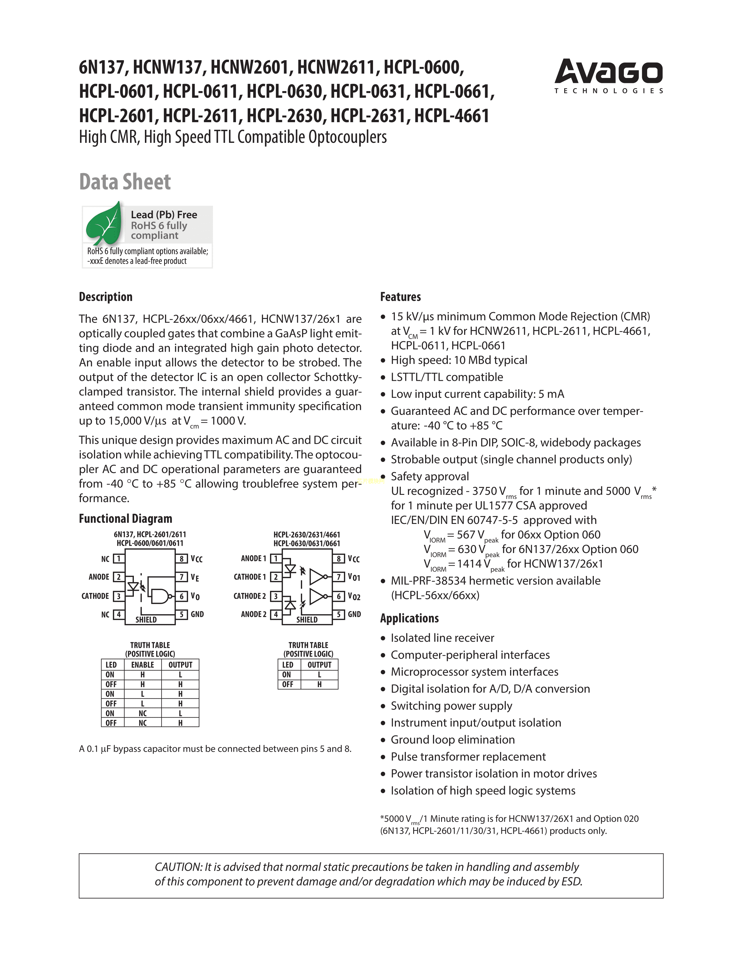 HCPL-0600-500E数据手册SO-8_3.9mm封装AVAGO(安华高)PDF规格书,中英文下载