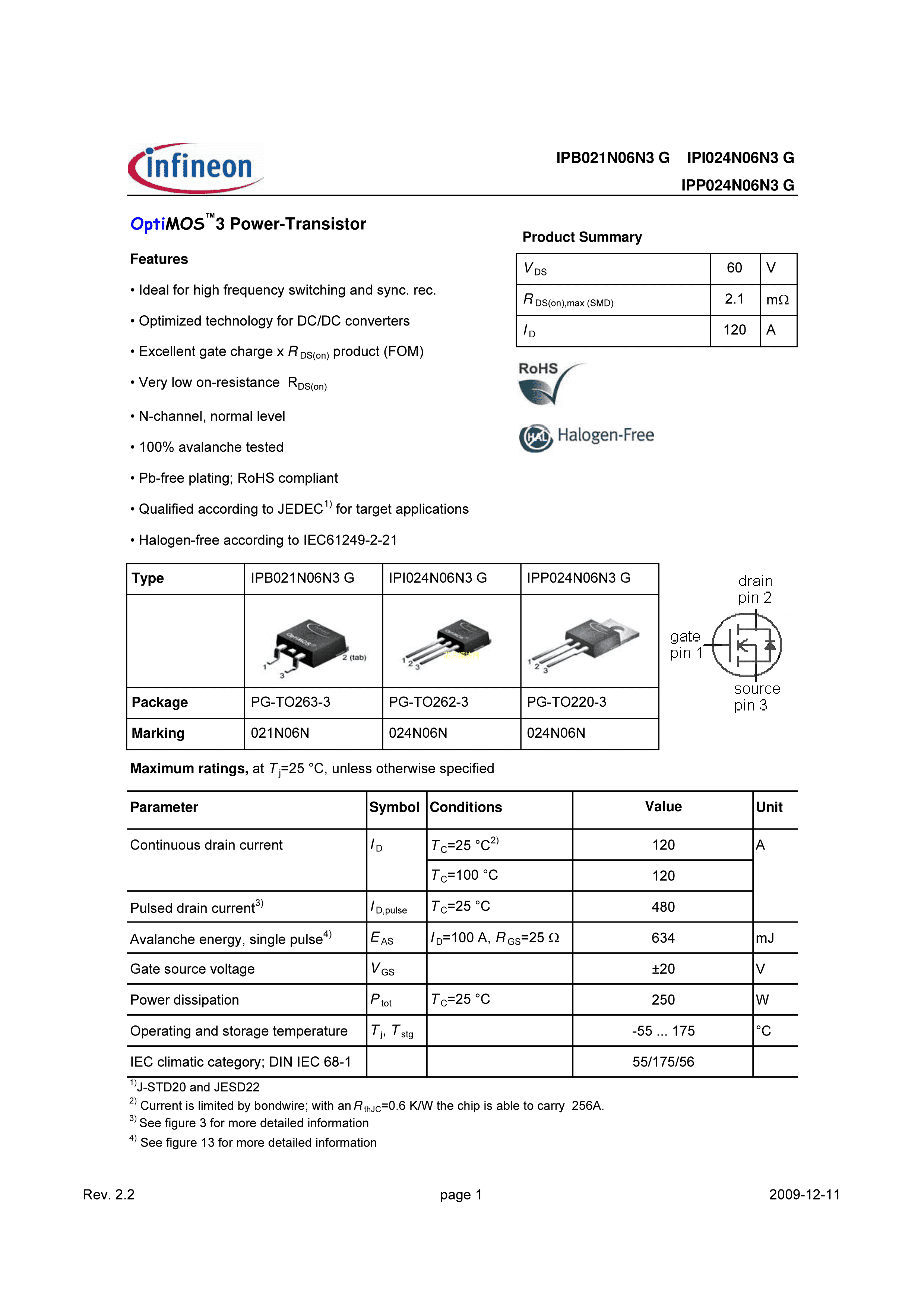 IPP024N06N3G数据手册PG-TO220-3封装Infineon(英飞凌)PDF规格书,中英文下载