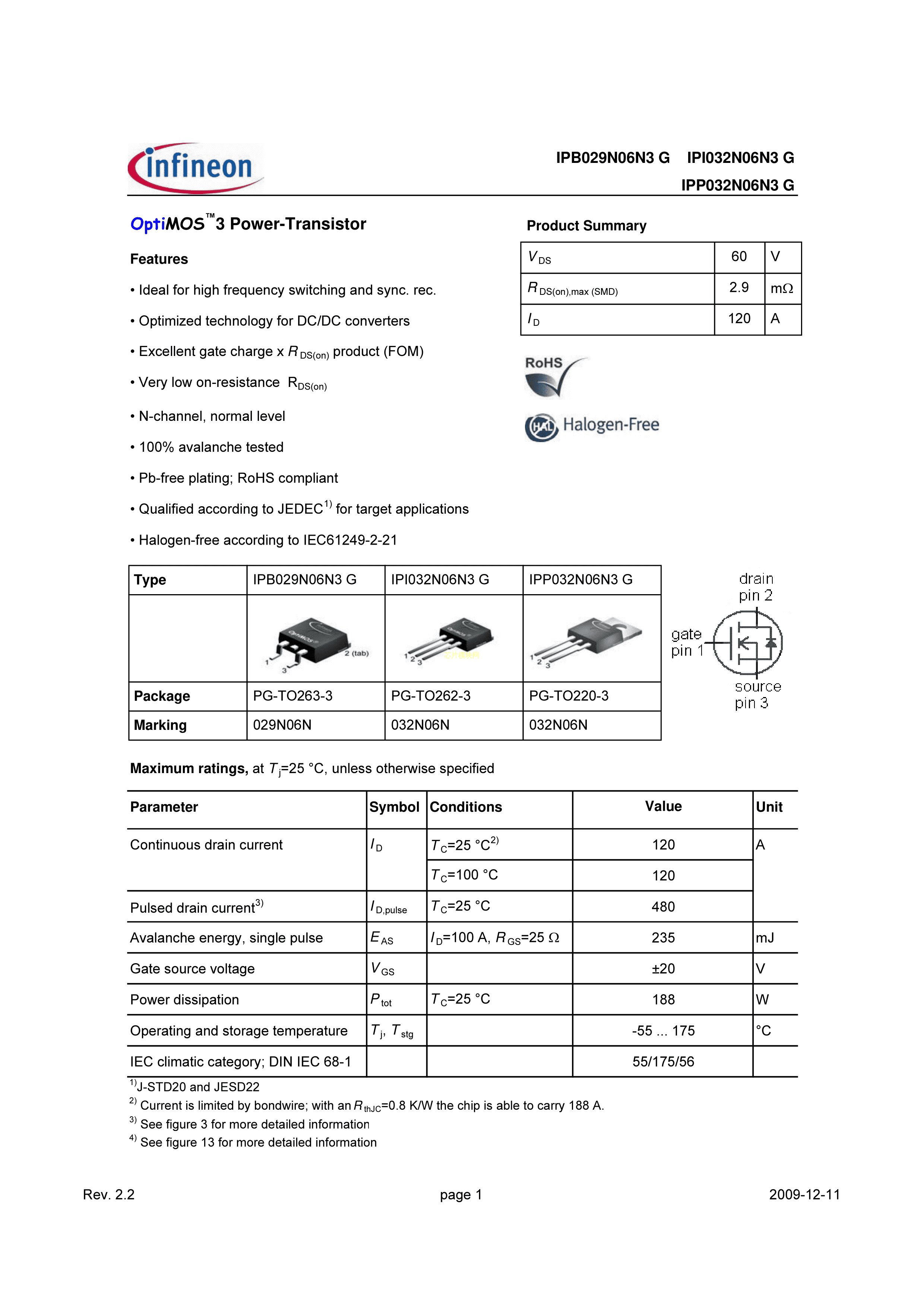 IPP029N06N数据手册PG-TO220-3封装Infineon(英飞凌)PDF规格书,中英文下载