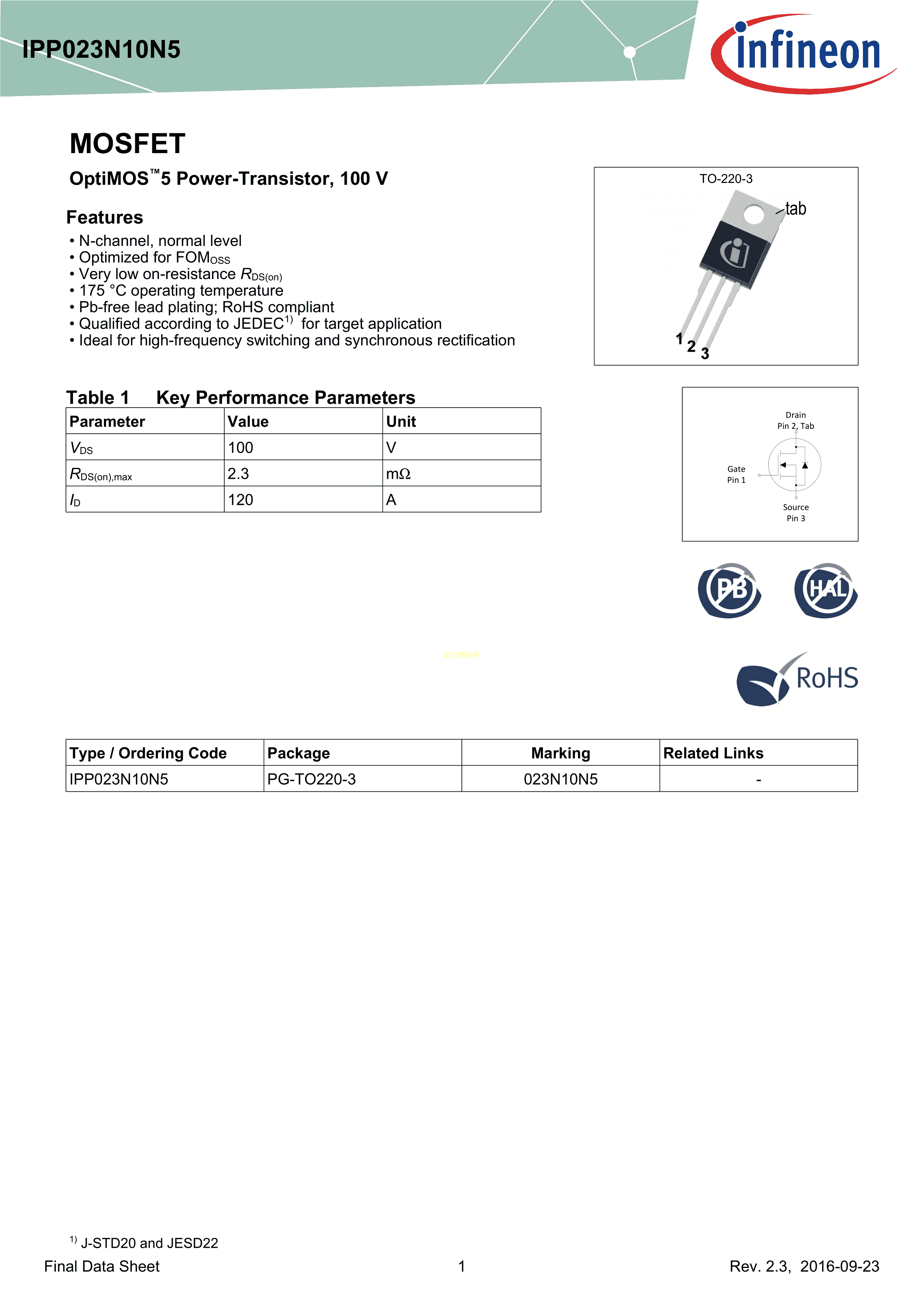 IPP023N10N5数据手册PG-TO220-3封装Infineon(英飞凌)PDF规格书,中英文下载