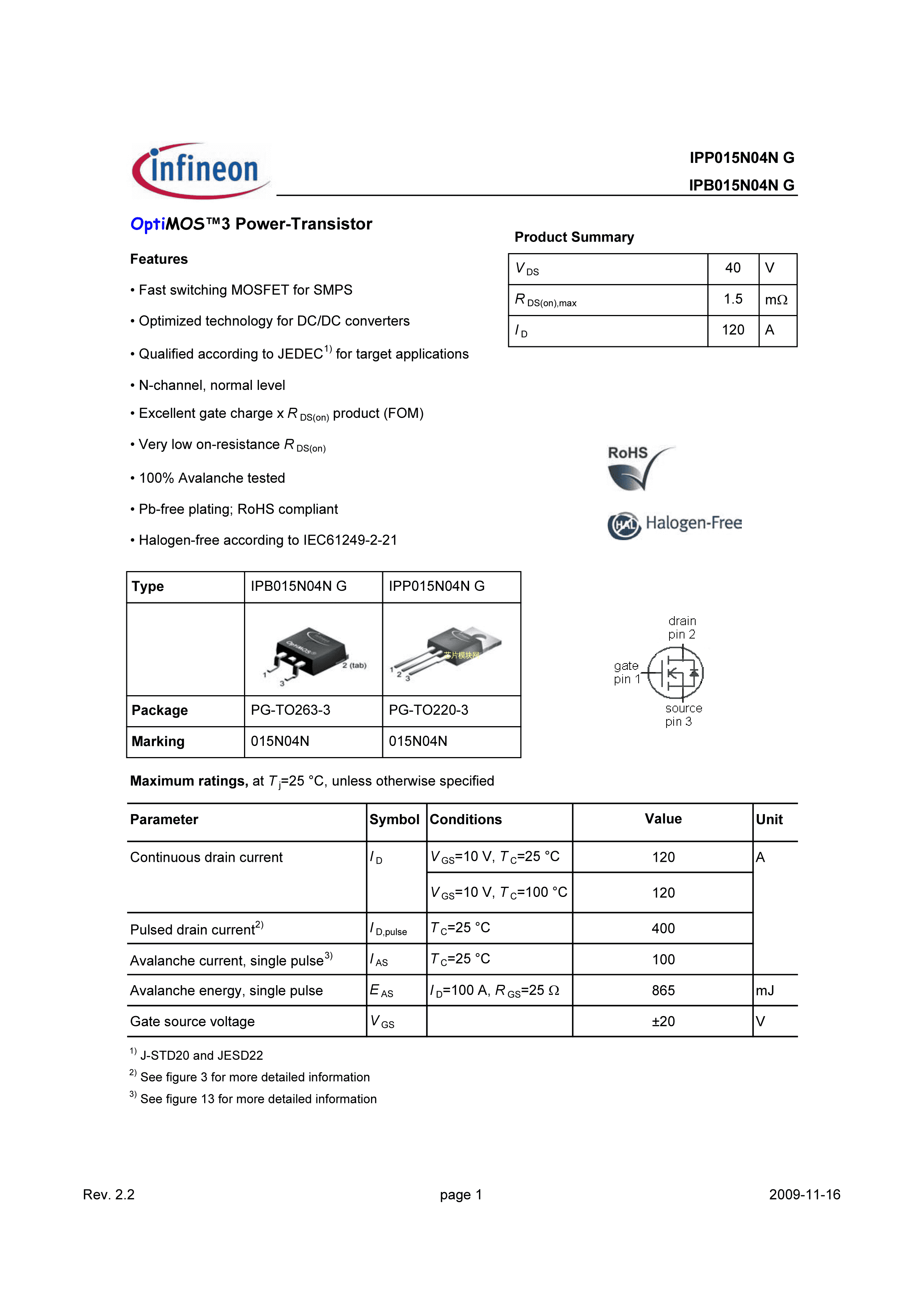 IPP015N04NG数据手册PG-TO220-3封装Infineon(英飞凌)PDF规格书,中英文下载