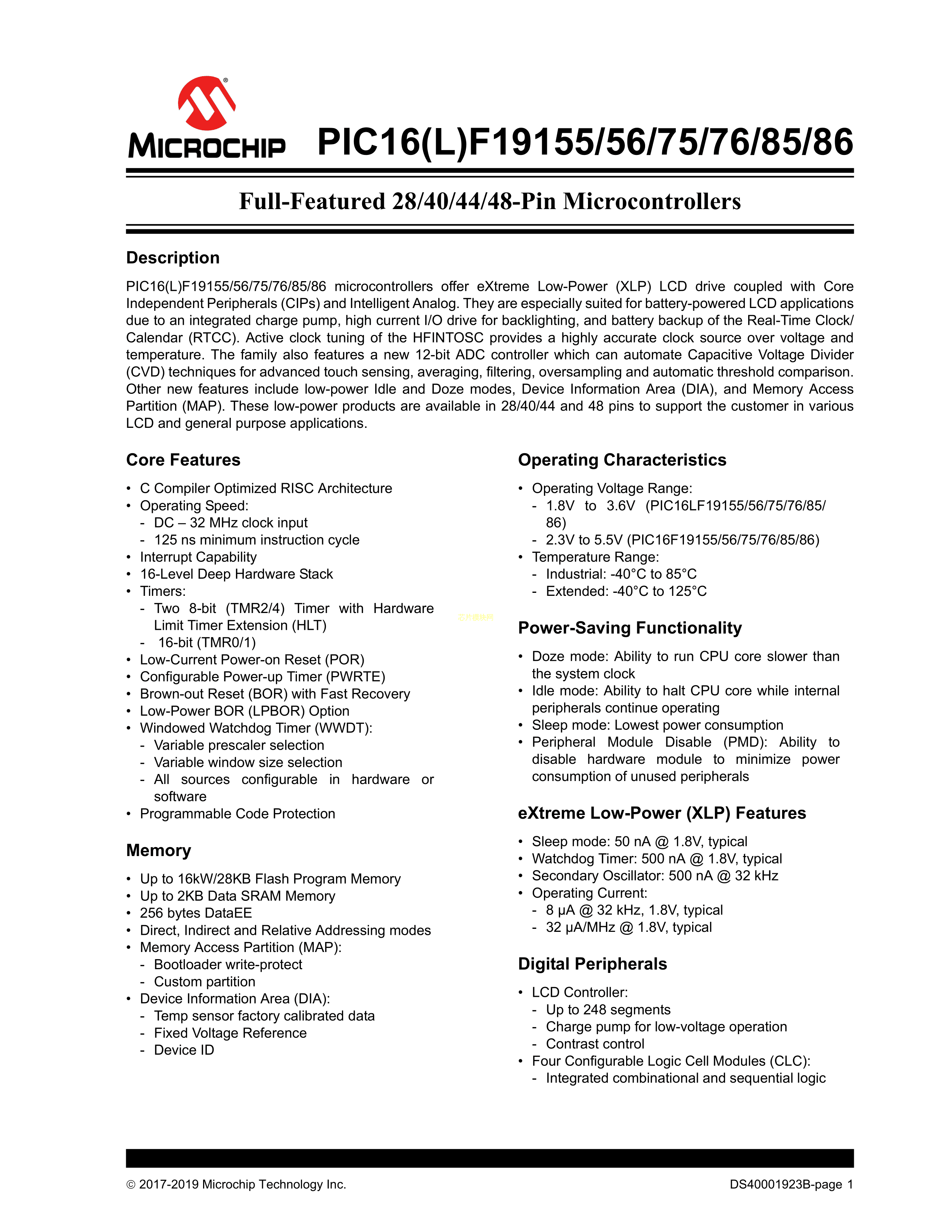 PIC16LF19185T-I-MV数据手册UQFN-48封装MICROCHIP(美国微芯)PDF规格书,中英文下载