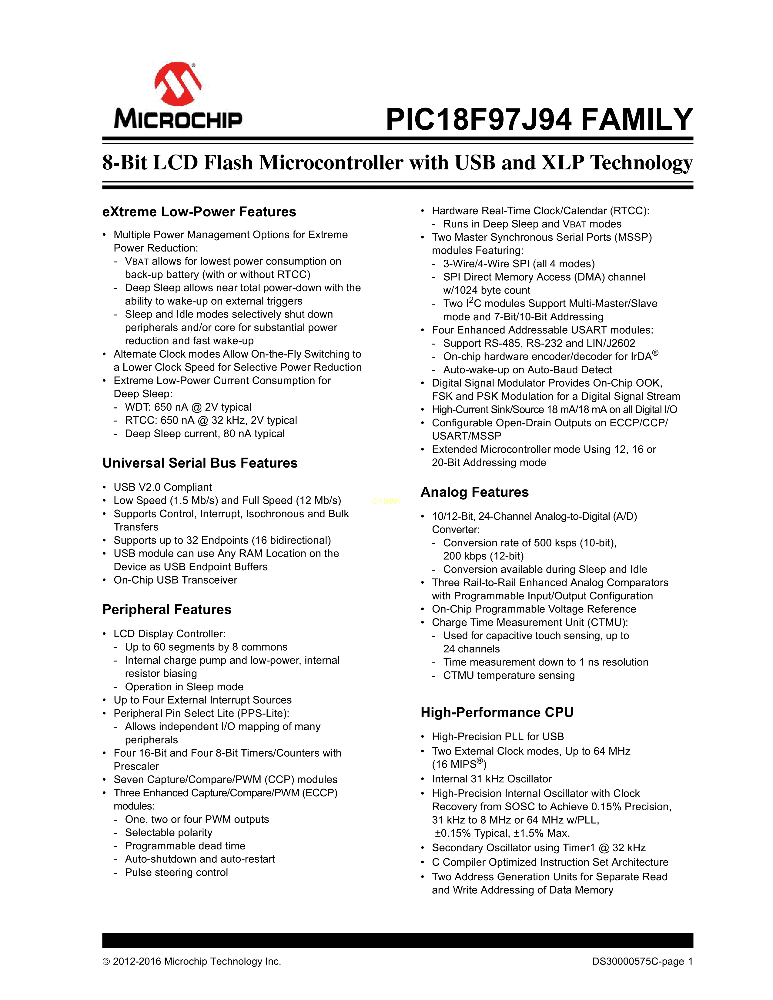 PIC18F65J94T-I-MR数据手册QFN-64封装MICROCHIP(美国微芯)PDF规格书,中英文下载