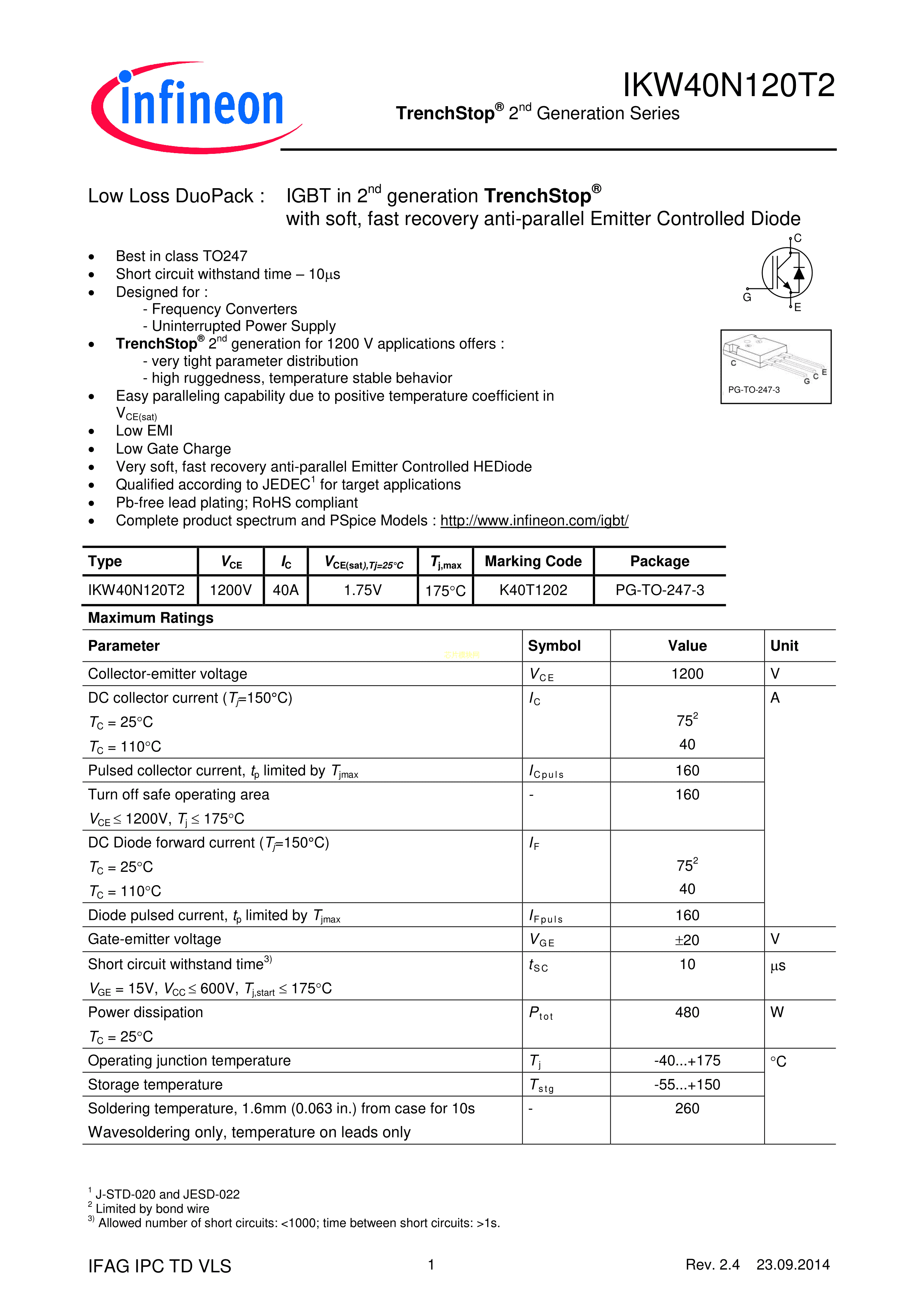 IKW40N120T2数据手册TO-247封装Infineon(英飞凌)PDF规格书,中英文下载