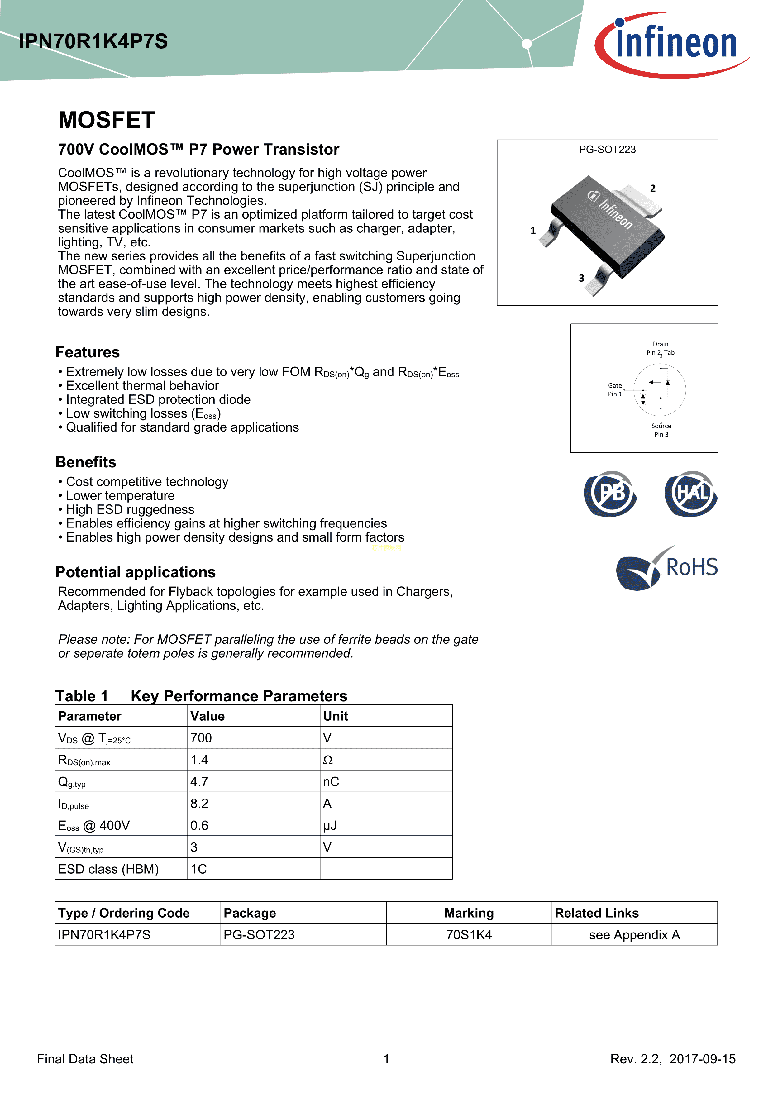 IPN70R1K4P7S数据手册PG-SOT223封装Infineon(英飞凌)PDF规格书,中英文下载