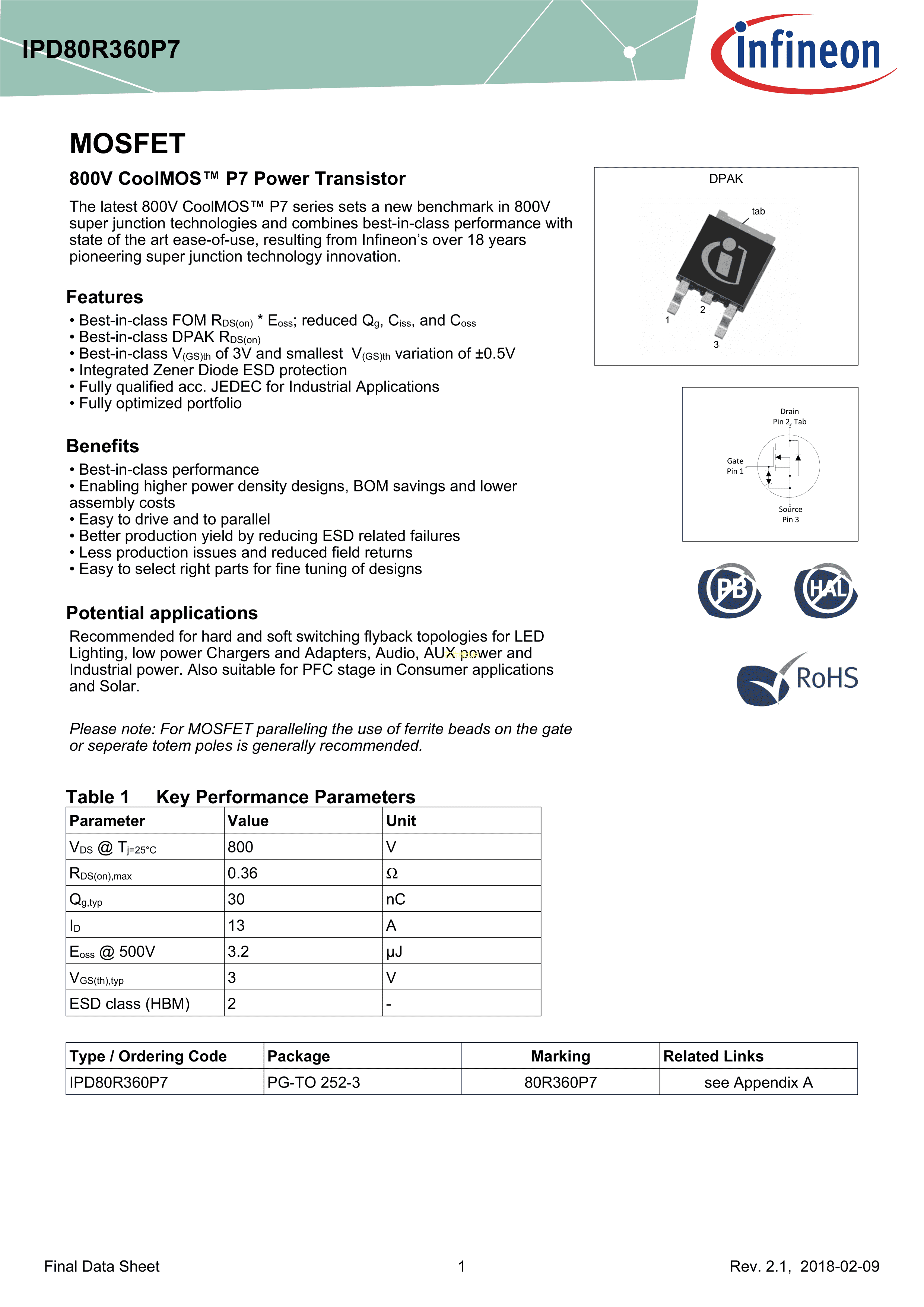 IPD80R360P7数据手册PG-TO252-3封装Infineon(英飞凌)PDF规格书,中英文下载