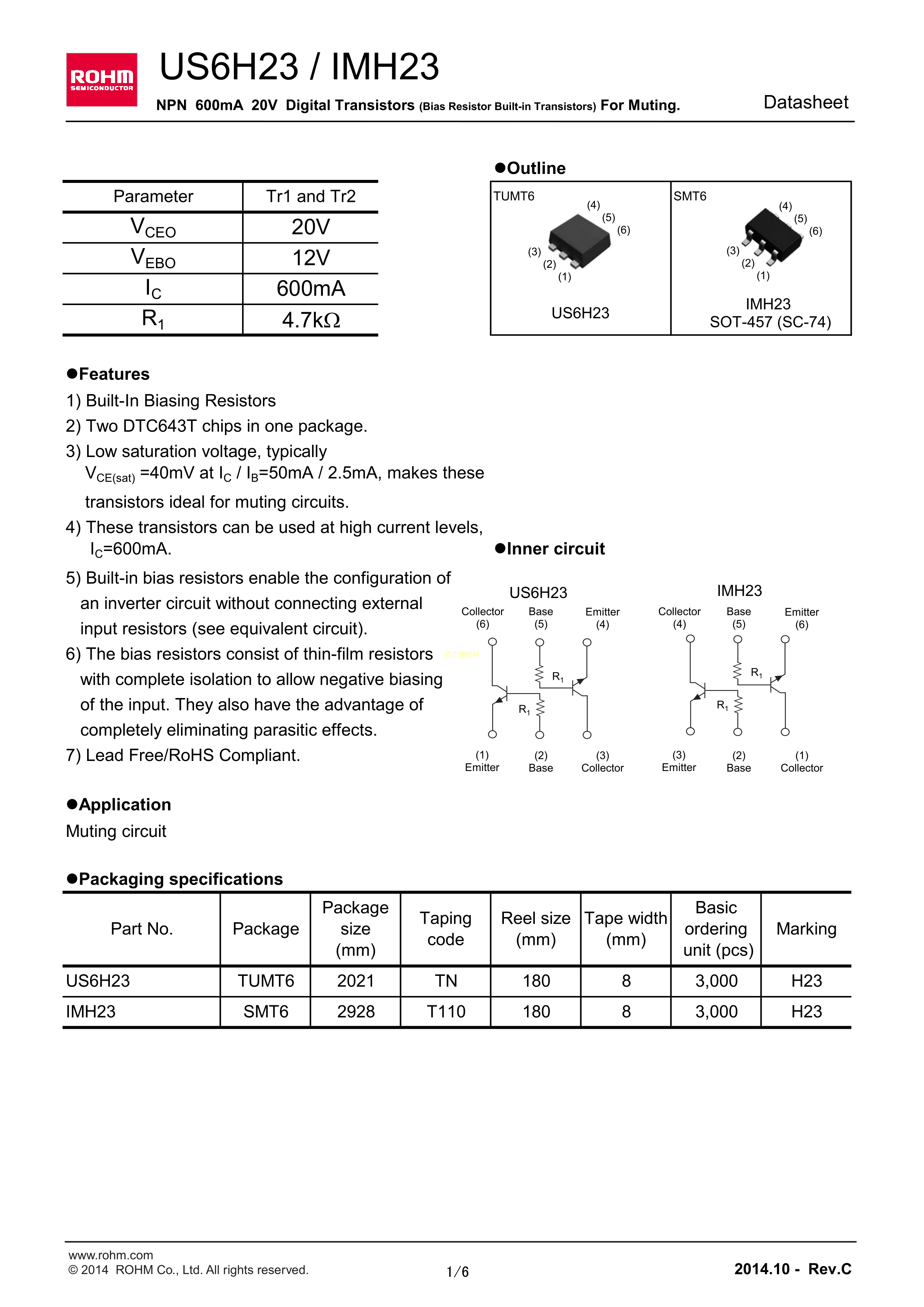 IMH23T110数据手册SOT-457封装ROHM(罗姆)PDF规格书,中英文下载