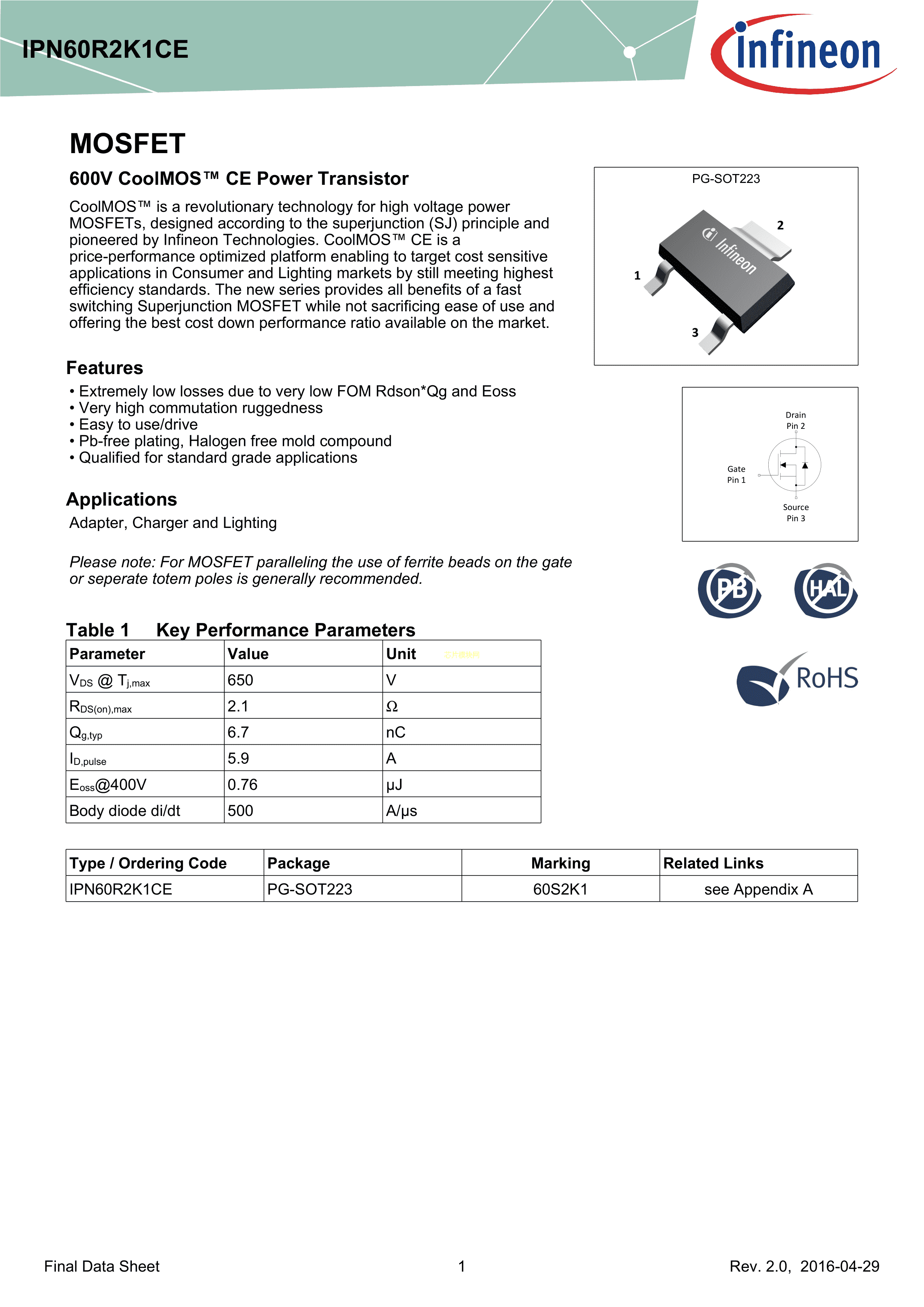 IPN60R2K1CE数据手册PG-SOT-223-3封装Infineon(英飞凌)PDF规格书,中英文下载