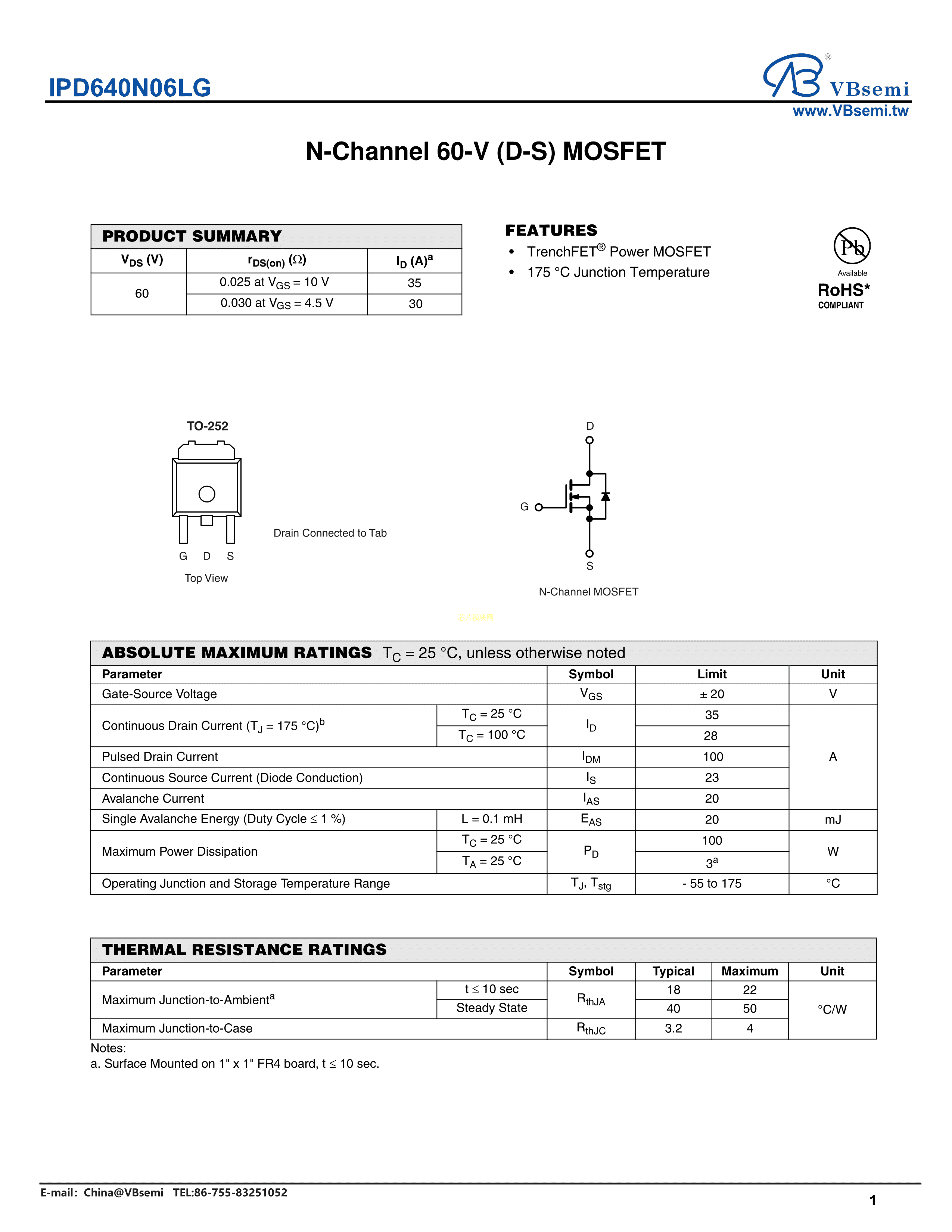 IPD640N06LG数据手册TO-252封装VBsemi(台湾微碧)PDF规格书,中英文下载