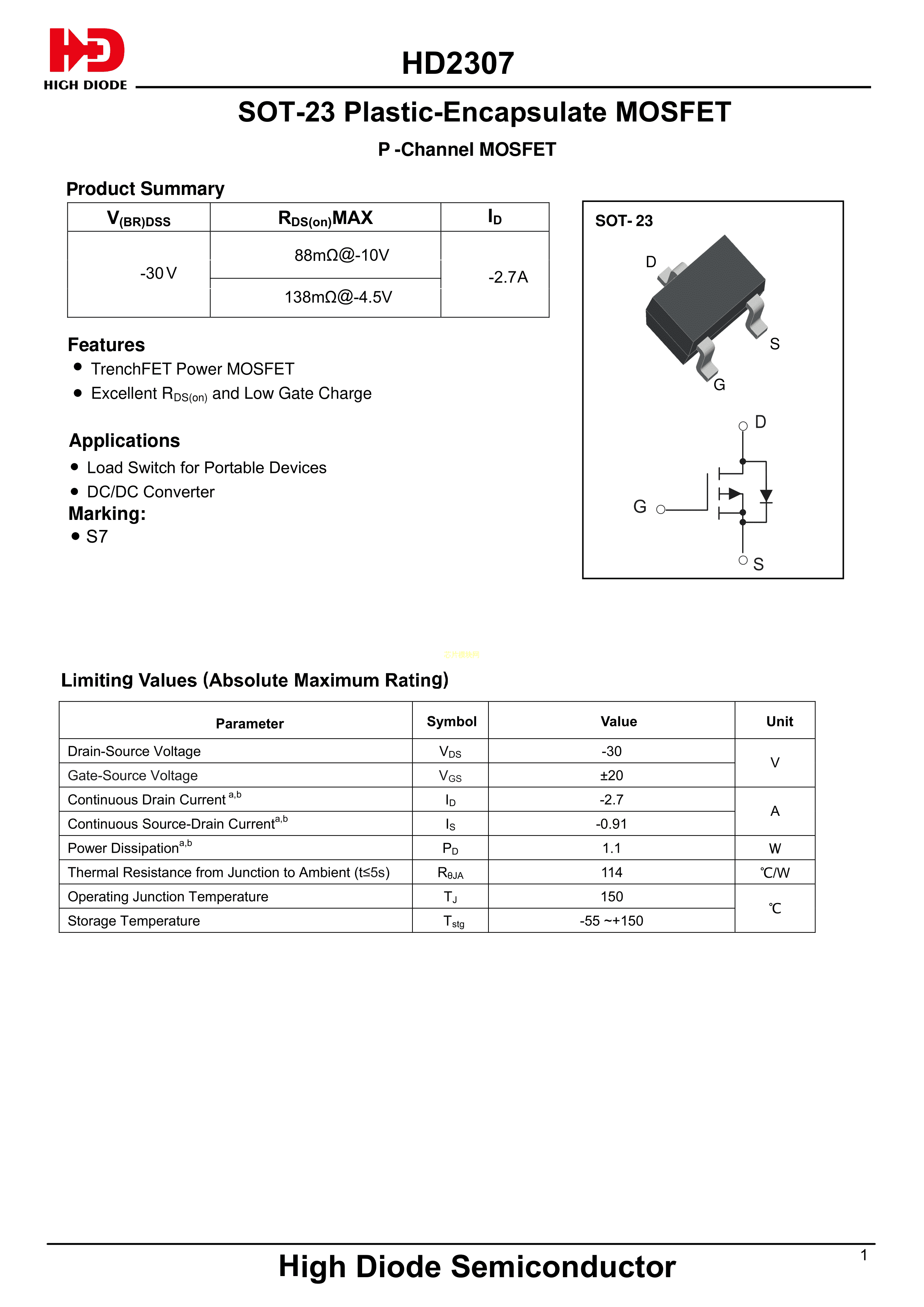 HD2307数据手册SOT-23封装HighDiode(海德)PDF规格书,中英文下载