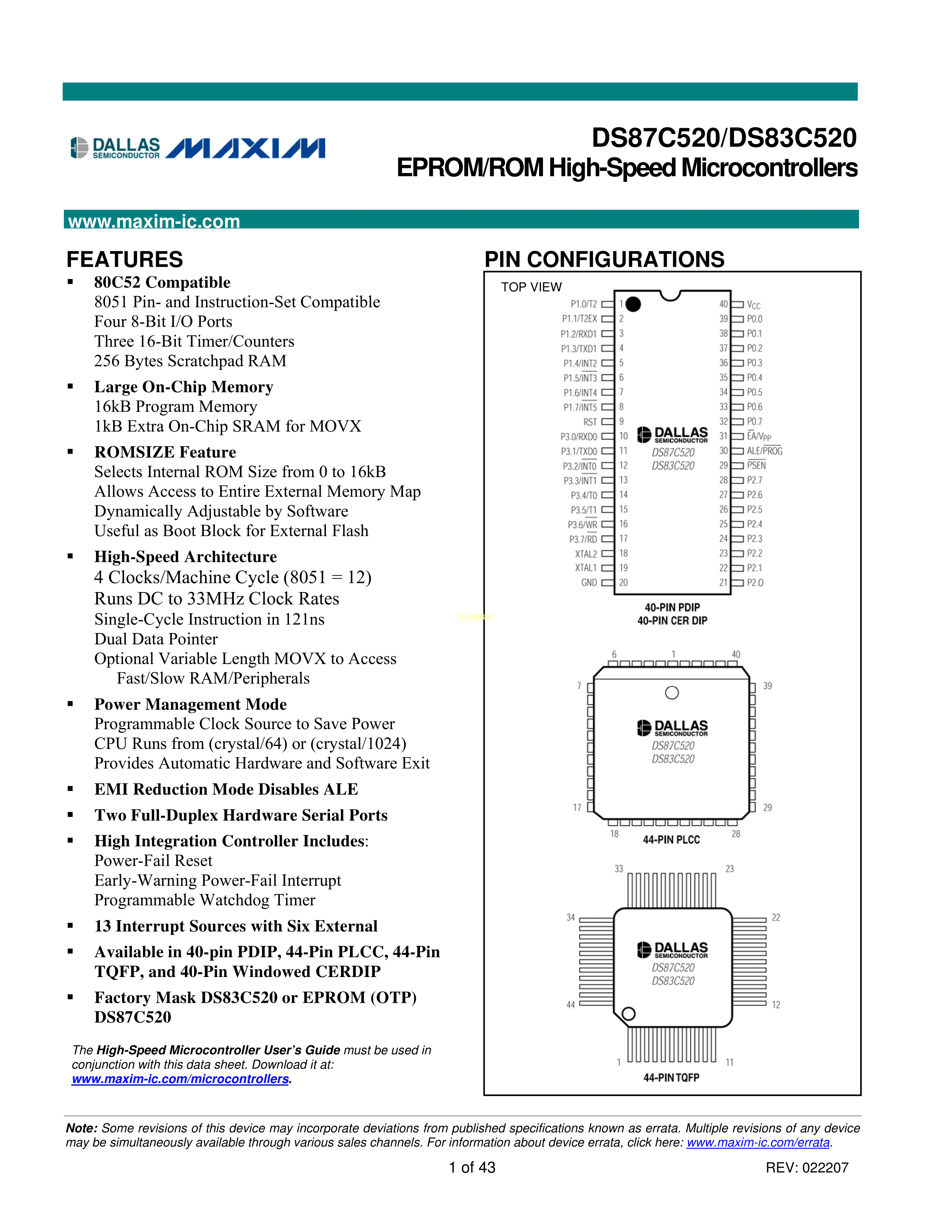 DS87C520-QNL+TR数据手册PLCC-44(16.59x16.59)封装MAXIM(美信)PDF规格书,中英文下载