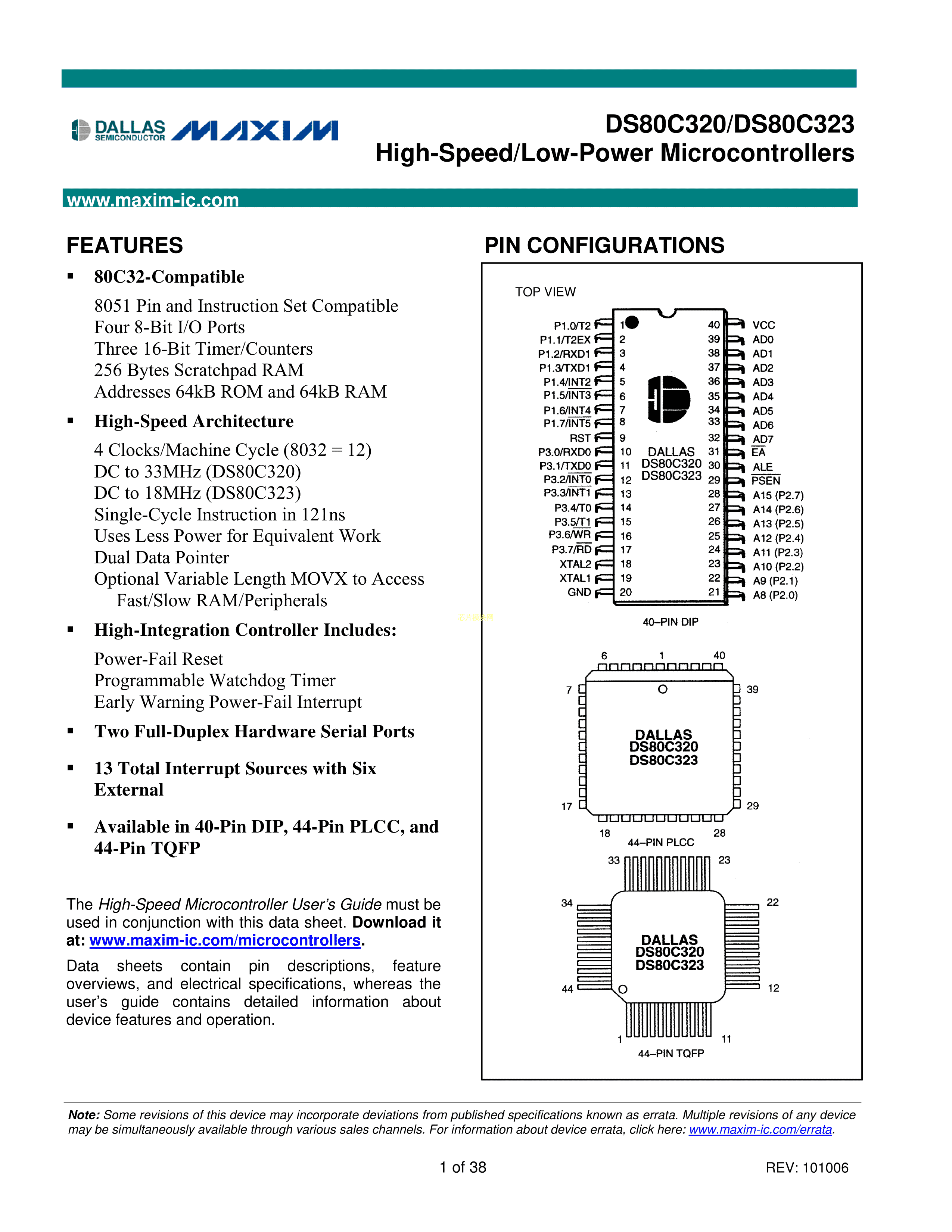 DS80C320-QNL+TR数据手册PLCC-44(16.59x16.59)封装MAXIM(美信)PDF规格书,中英文下载