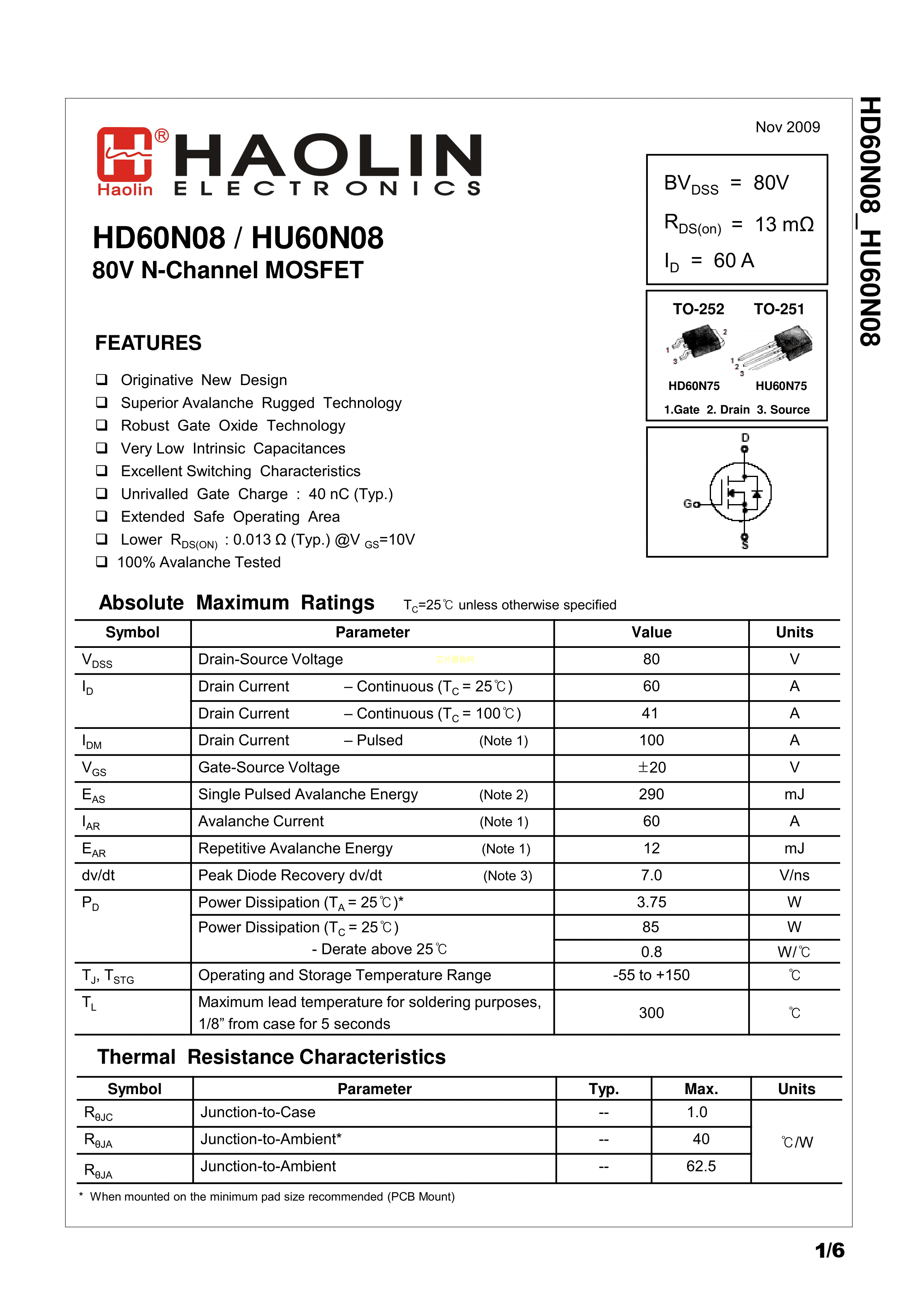 HD60N08(AGF)数据手册TO-252封装HL(豪林)PDF规格书,中英文下载